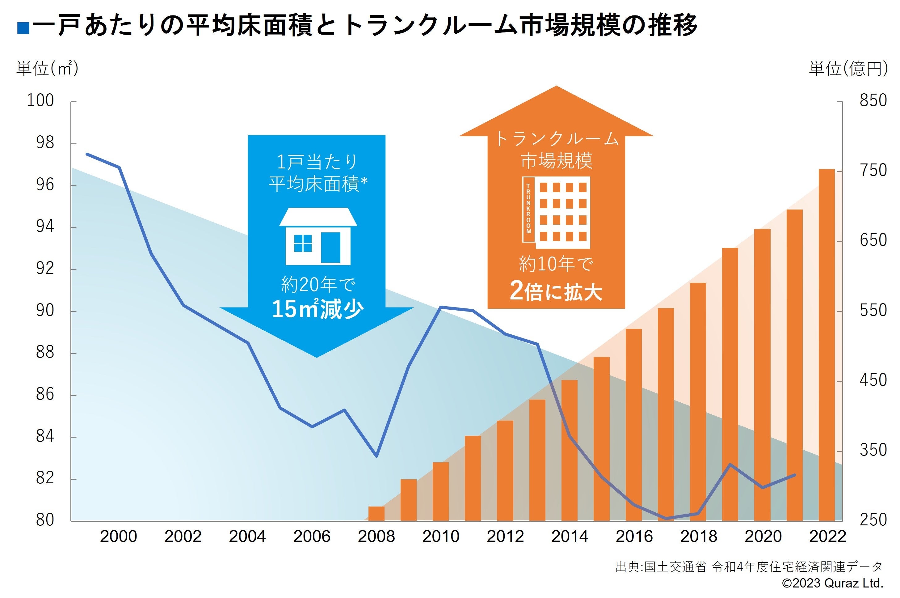 一戸当たり平均床面積とトランクルーム市場規模の推移