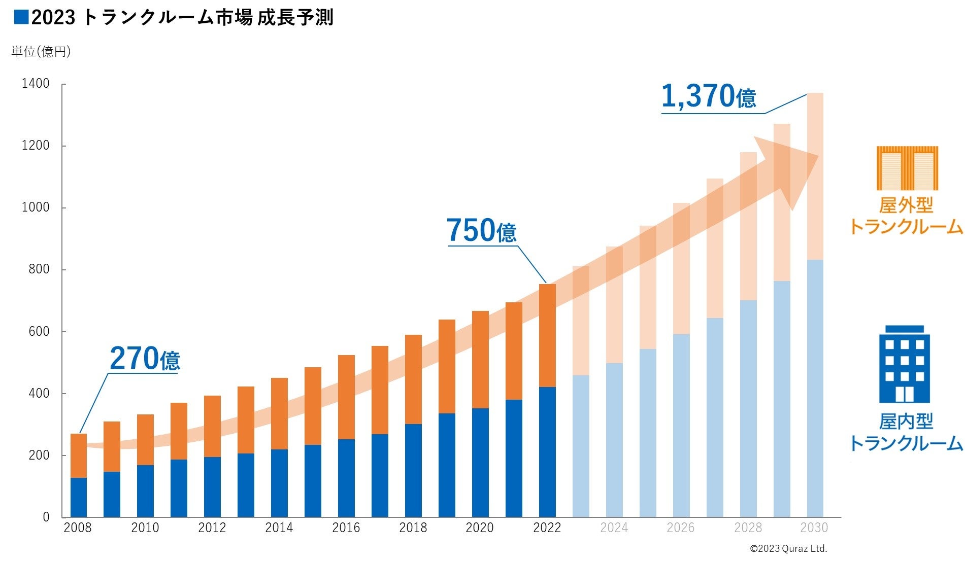 キュラーズが毎年実施する「トランクルーム市場調査」による最新の試算では、トランクルーム市場(屋内・屋外含む)は調査を開始した2008年と比べ、2023年は2.8倍増となる750億円、2030年には約5倍となる1,370億円と大きく成長する可能性が見込まれ、今後の市場動向に国内外から高い期待と注目を集めています。