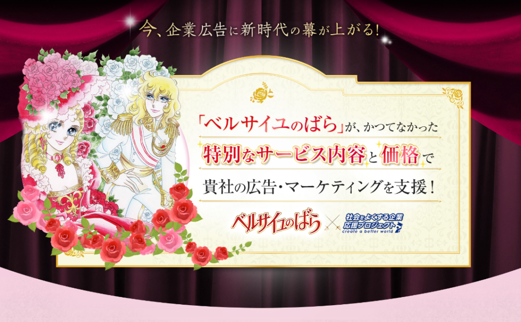シリーズ累計発行部数2,000万部を超える人気作として今なお多くのファンがいる『ベルサイユのばら』が社会課題の解決や世の中をよくする企業、社会問題に取り組む企業を応援する「社会をよくする企業応援プロジェクト」への参画が決定しました。『ベルサイユのばら』はこれまでも様々な企業の広告販促としてタイアップを行ってきており多くのシーンで利用されております。特に女性をターゲットとした商品やサービスとの親和性が高いため多くの企業からの要望がございました。