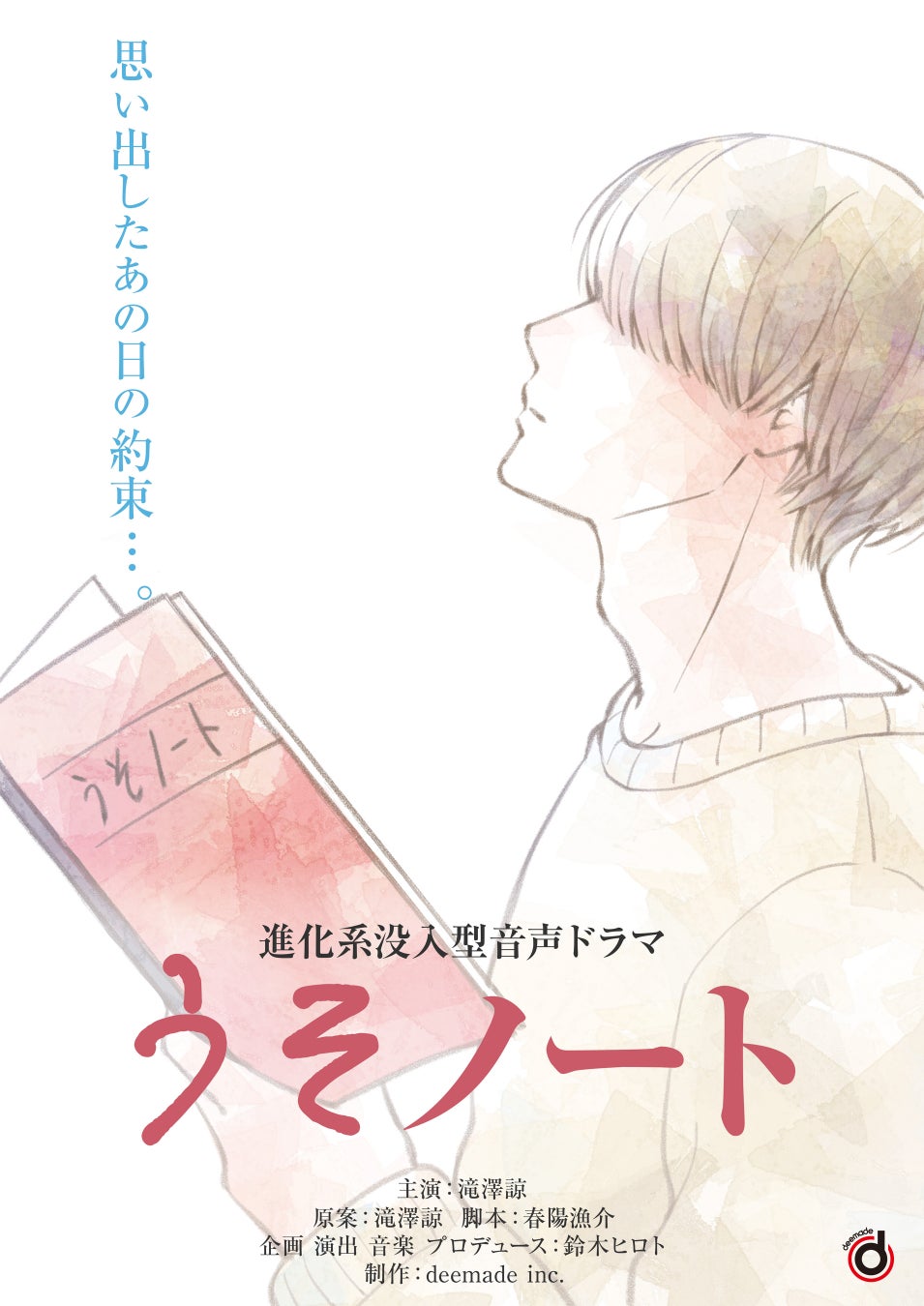 音声ドラマ「うそノート」は、新曲「うその音」から滝澤本人がインスピレーションを受け原案を作成しました。主人公のマコトが、旧友レイとの思い出話から子どもの頃に書きためていた「うそノート」の存在を思い出し、「嘘をついたら自分のことがわからなくなってしまう」という母の言葉の意味を探し求めていく、心の成長を描くハートフルな物語となっています。