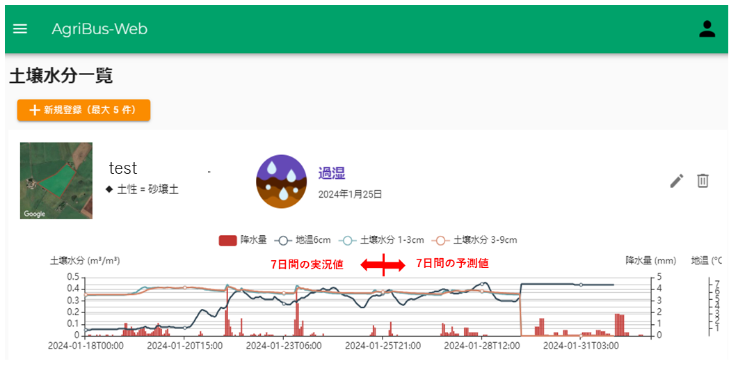 土壌水分は体積含水率で示され、深さ1~3cmと3~9cmの2つの深さのデータを表示します。データの時系列は地温と同様に当日を挟んで過去7日間の実況値と今後7日間の予測値が表示されます。予測値は地温と同様に作業時期の判断材料となります。
