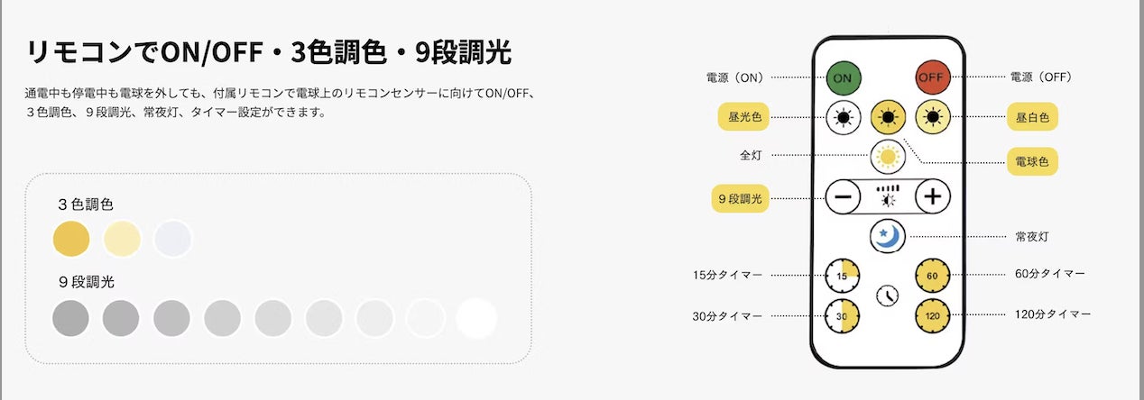 電源のON/OFF切替はもちろんのこと、3色調光、9段調光といった、あかりの色や輝度を細かく自分好みにカスタマイズできます。