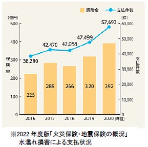 冬場の冷え込みにより気温がマイナス4度を下回ると水道が凍結するリスクが生じます。水道管凍結による断水や破損の被害が発生すると、日常生活に支障をきたすことに加え、修理に大きな費用がかかる恐れもあります。損害保険料率算出機構の統計※によると、水濡れ損害による事故が年々増加しており、背景として、気象要因による水道管凍結事故が増えていることが指摘されています。