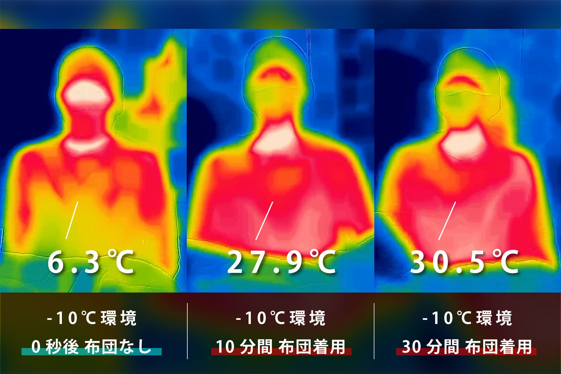 フェアリーノヴァ掛け布団で使うHeat Ether™(ヒートエーテル)は、NASAが宇宙服で使う断熱素材と同様の技術を応用して開発した素材を配合した断熱材を独自加工し、配合した特殊生地です。地球に近い月の温度でさえ、-170~+110度となり、配合素材はこのような過酷な寒暖差の中で活躍する宇宙服等に使われて活躍しています。掛け布団を実際に実験して、検証した結果がこちらです。