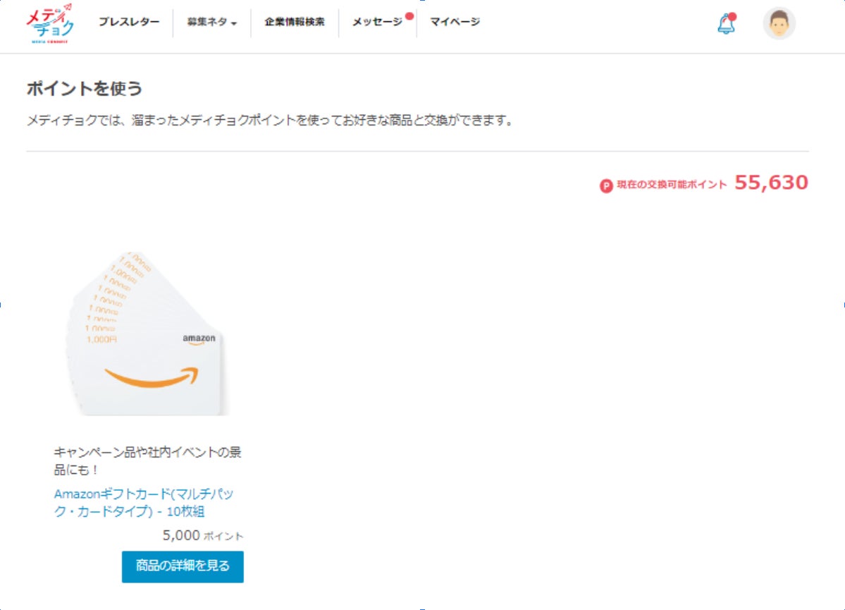 メディチョクに登録しているメディア担当者は、メディチョクの利用に応じてポイントがたまり、貯まったポイントはAmazonギフト券に交換が可能となります(※ポイント付与は翌々月10日付与/※ポイント交換は5000円分から)