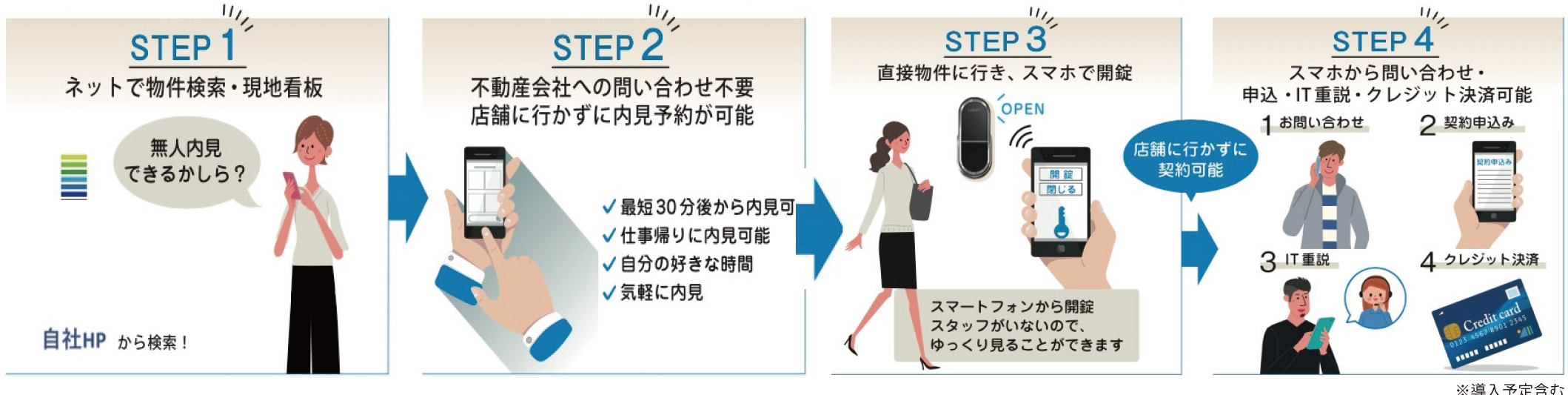 ユーザーは、WEB上で希望の物件を選択し、希望の時間に「内見」の予約を入れます。予約した日時に直接現地を訪問、スマートフォンに表示される開錠ボタンをタップし、物件の玄関ドアのスマートロックを開錠するといった非対面で内見できるシステムです。賃貸物件の場合は、内見後そのままWEB申し込み、IT重説、初期費用の支払いまで内見者のスマホで完結できます。