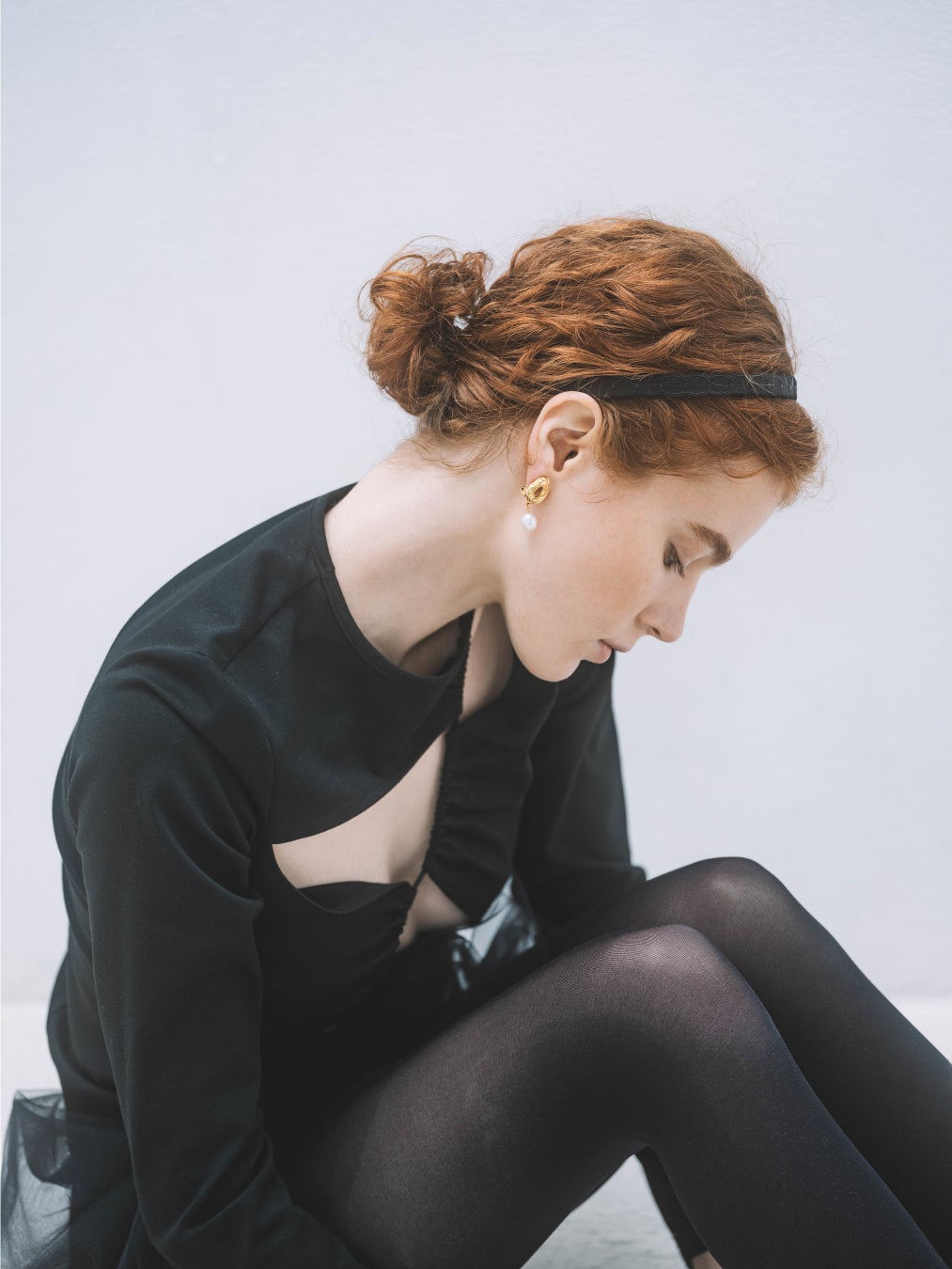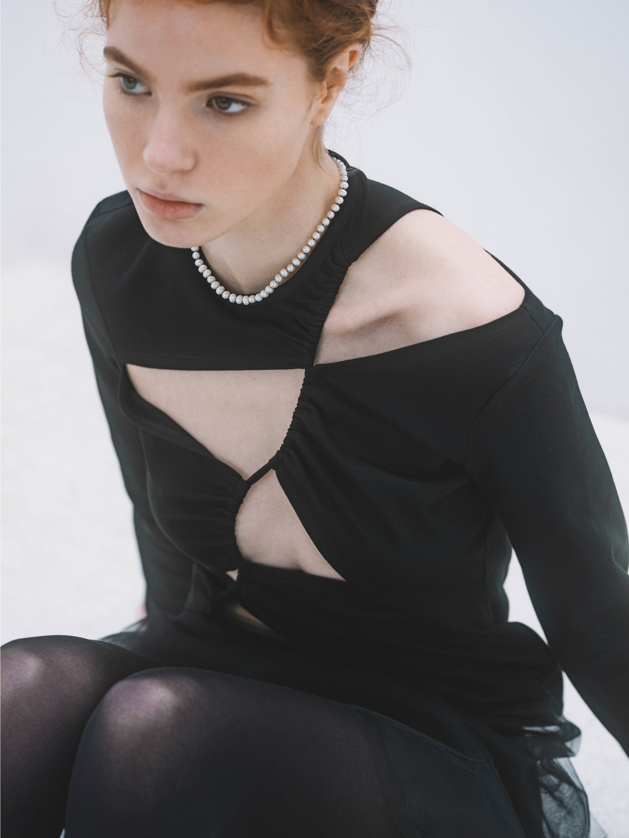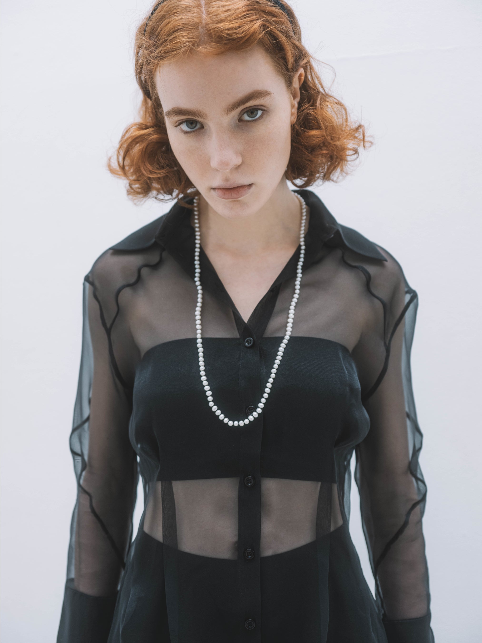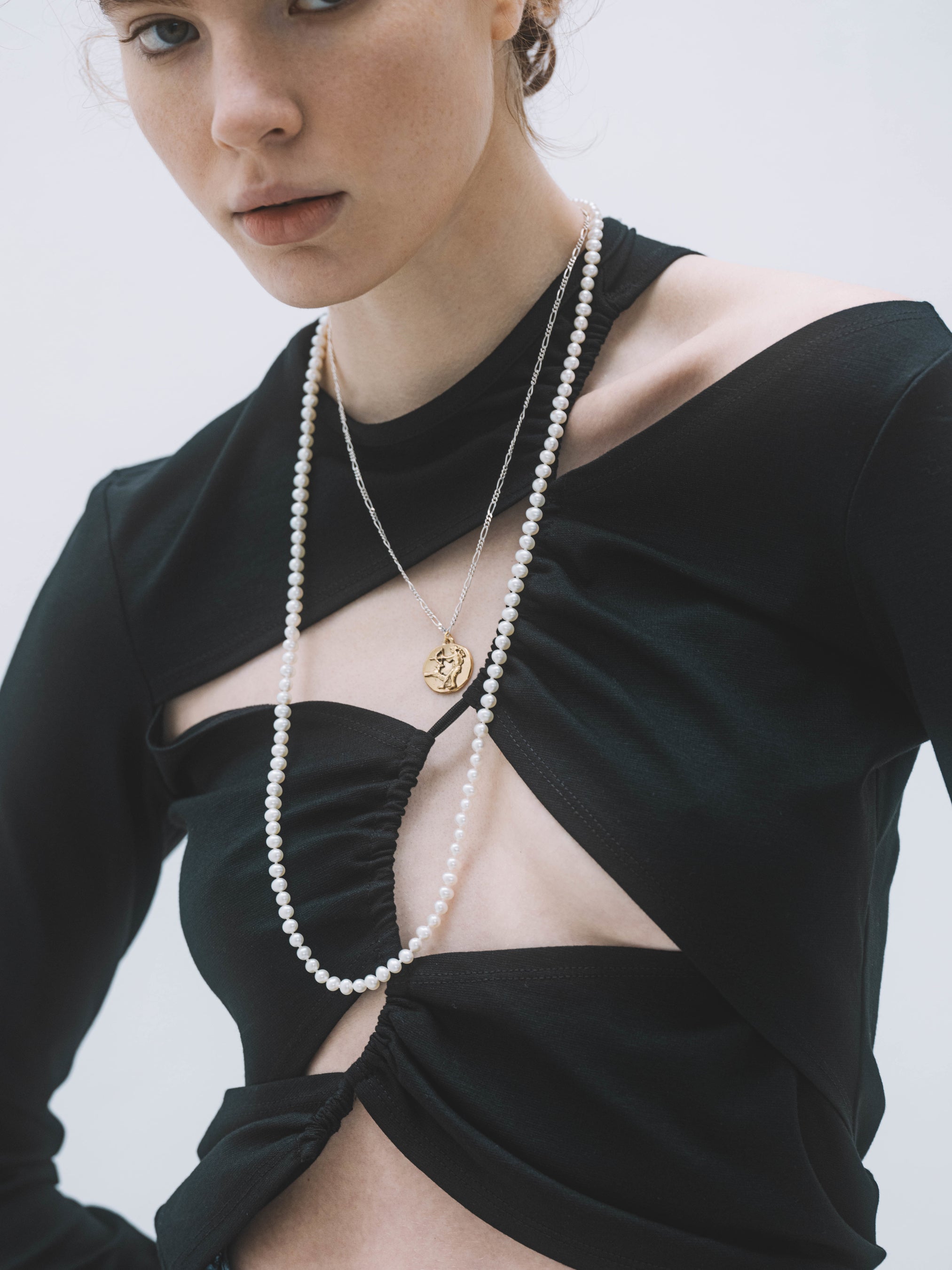 海の女神“calyso”をイメージしたネックレスは、パールのもつ有機的なフォルムをいかして。黒い糸に0.5cmのパールを通し、粒と粒との間があくよう糸を結び、パールの形を際立たせ、穏やかな波のような線を表現。黒い糸と白いパールとのコントラストで、ベーシックなパールネックレスとはひと味違うモードな雰囲気に。