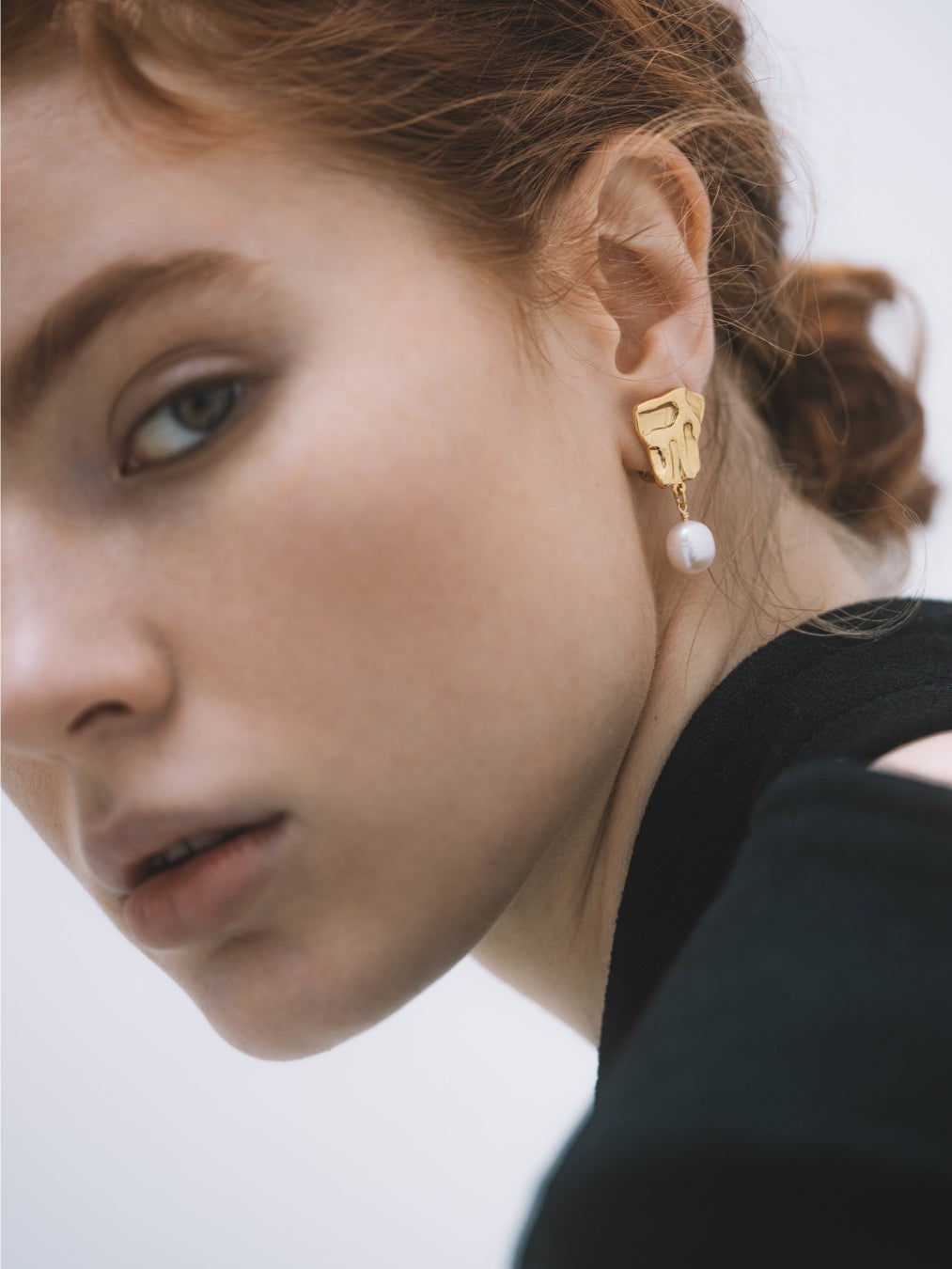 凹凸のあるモチーフは古代ギリシャの建物の壮大さを、その中央に隙間をあけることで、朝の光が差し込むポジティブな様子を表現。先端にあしらった天然のバロックパールが、豊かな動きを生みます。