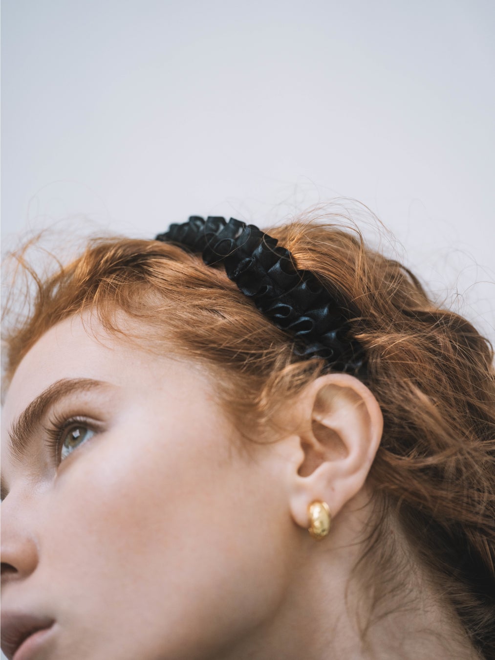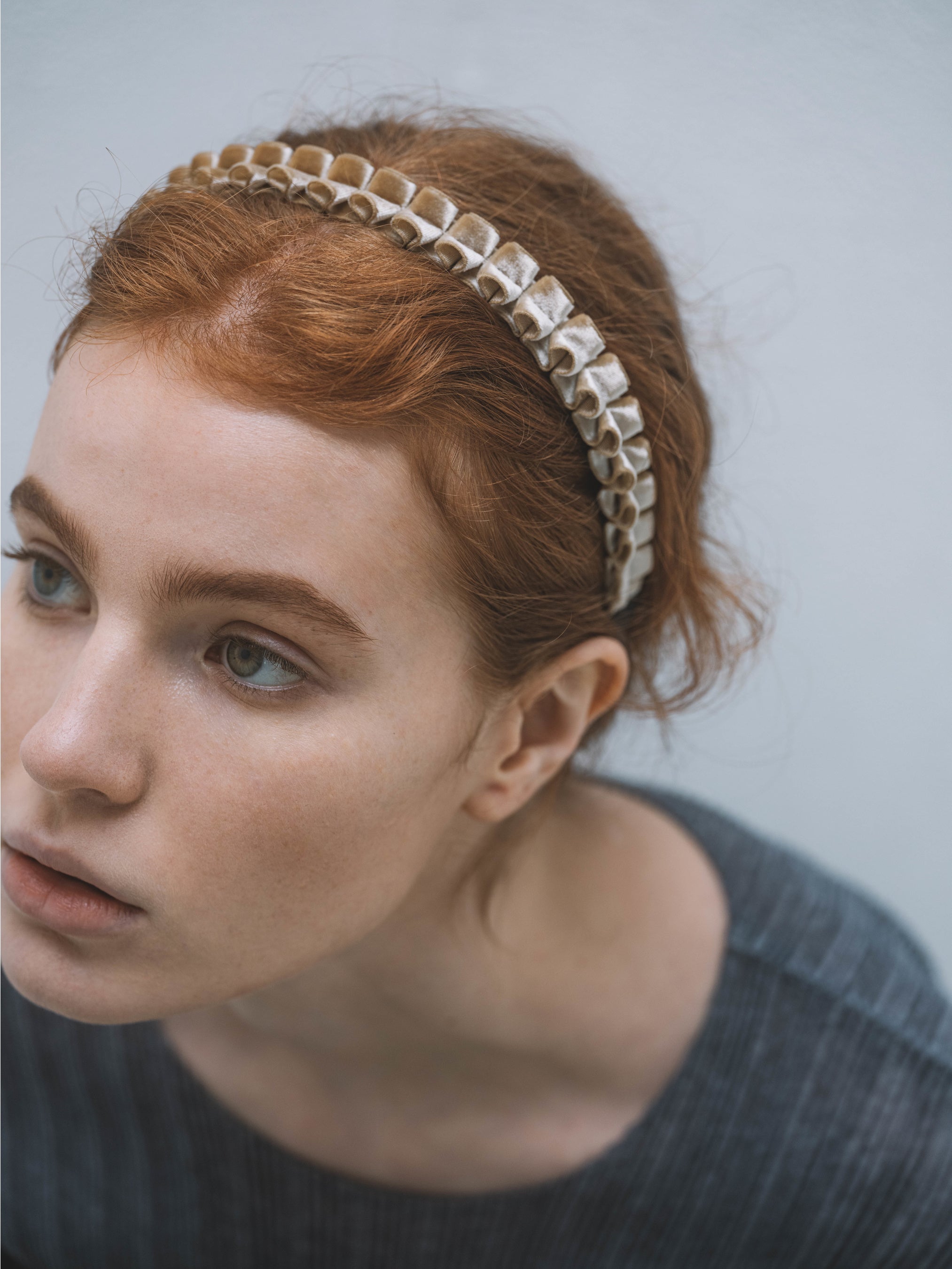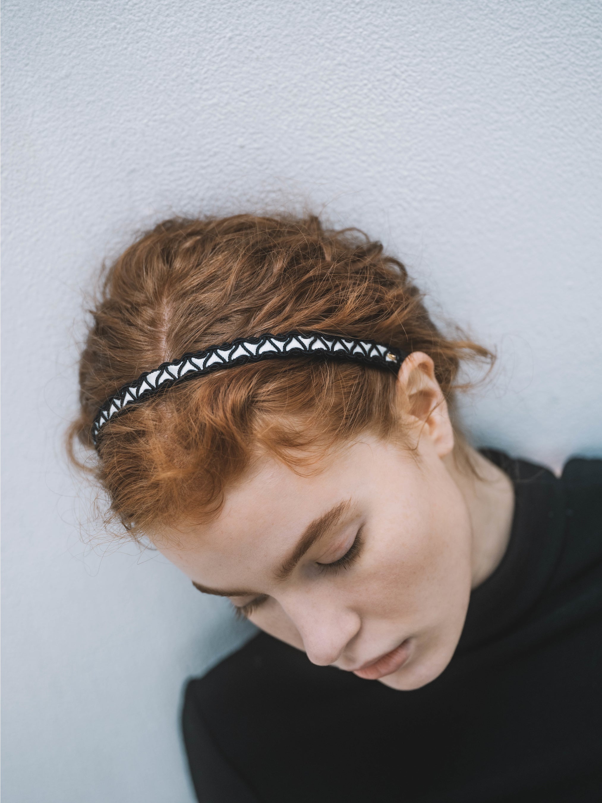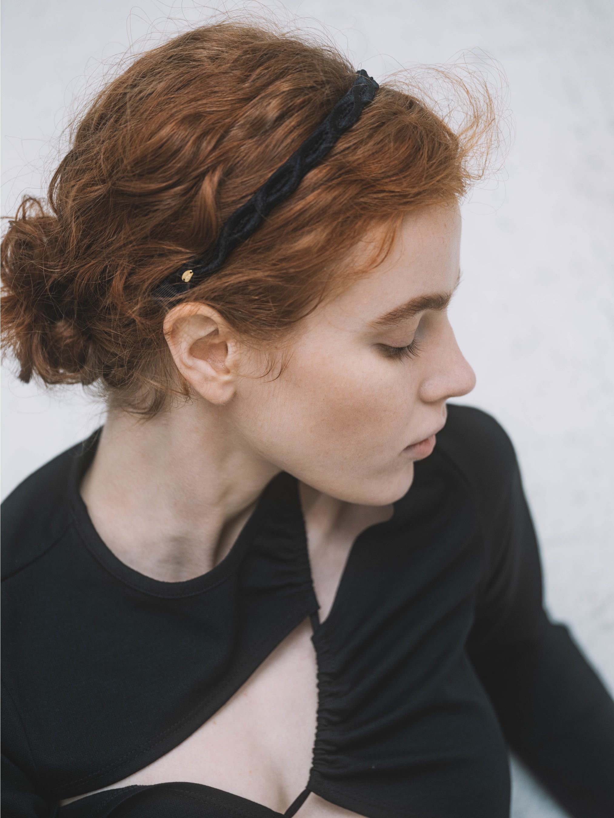 クルーネックやVネックなど、首周りがすっきりしたトップスとの相性がいい、立体的なヘッドバンドです。