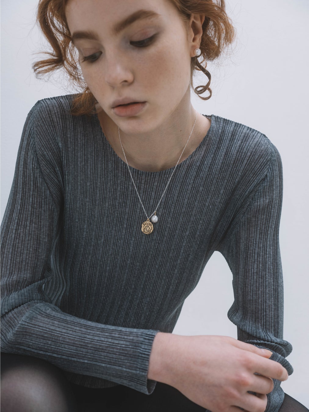 海の女神“calyso”をイメージしたネックレスは、パールのもつ有機的なフォルムをいかして。黒い糸に0.5cmのパールを通し、粒と粒との間があくよう糸を結び、パールの形を際立たせ、穏やかな波のような線を表現。黒い糸と白いパールとのコントラストで、ベーシックなパールネックレスとはひと味違うモードな雰囲気に。黒のコーディネートを相性のいい、シックな1本です。