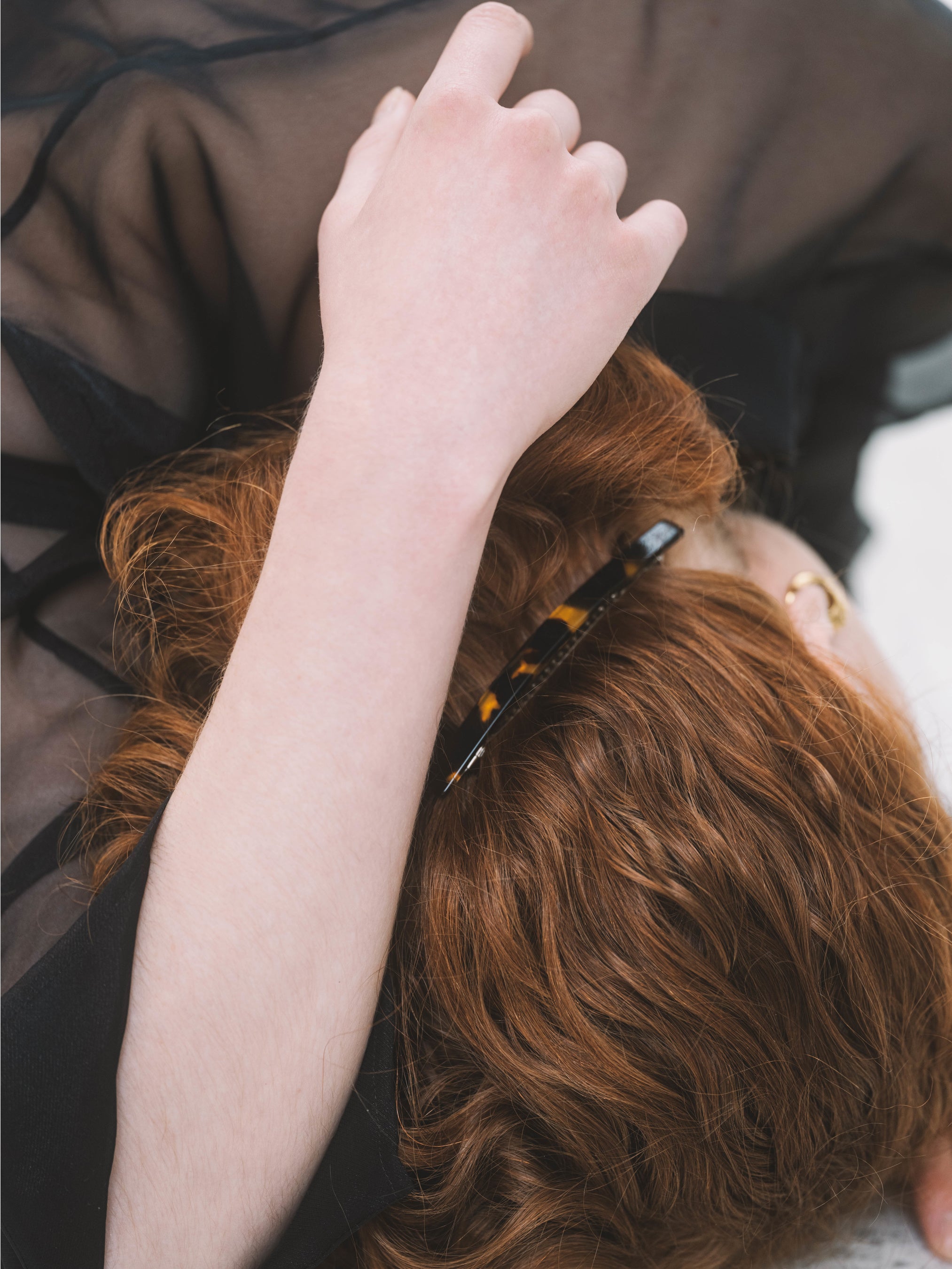 透け感があり軽やかな黒レースは、ダークなカラーのヘアとの馴染みがよく、落ち着いた雰囲気に。