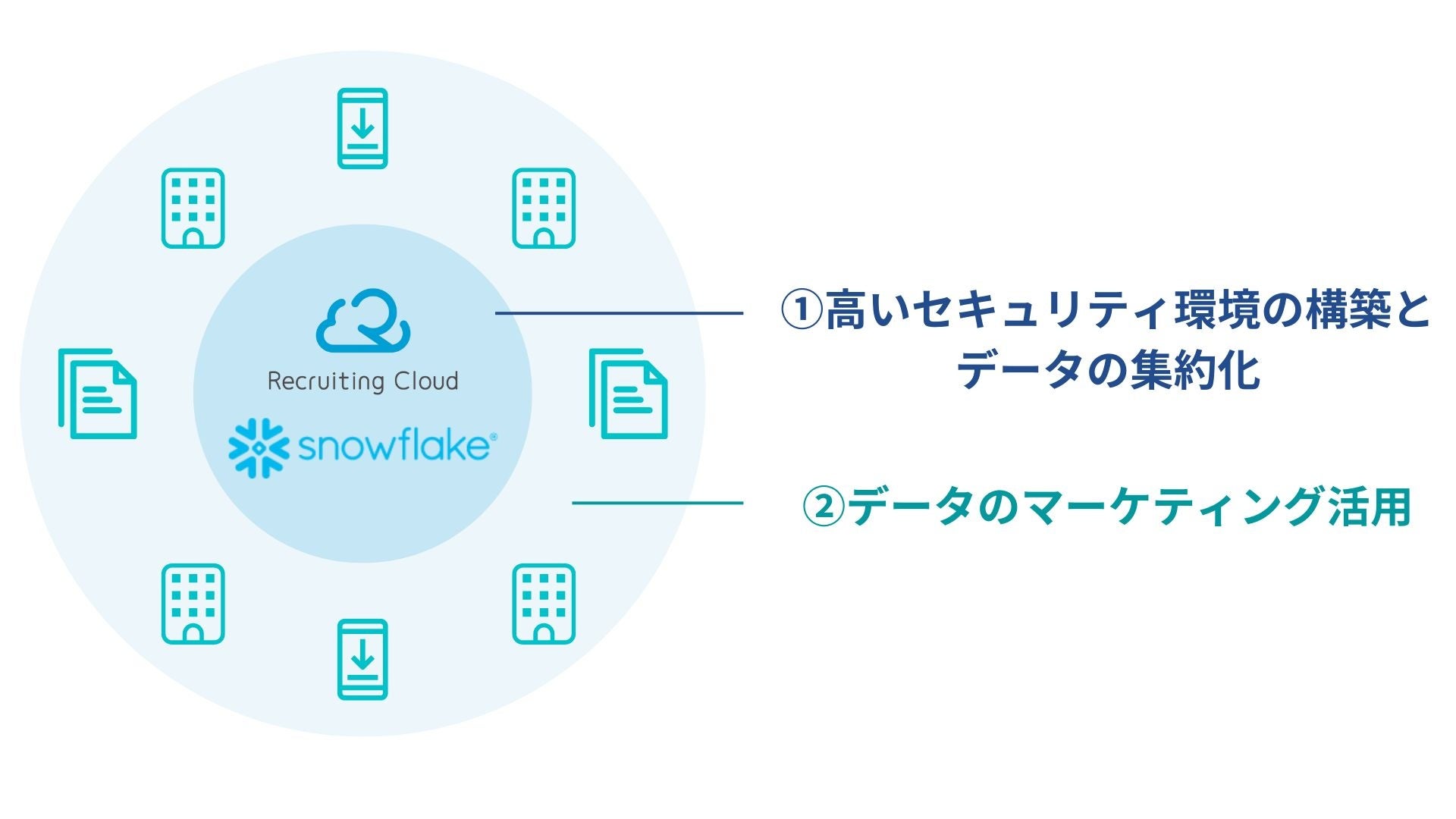 スノーフレイクが提供する「Snowflake マーケットプレイス」は、画期的なアプローチにより、データへ直接アクセスし、迅速なデータの発見、安全かつ高いコストパフォーマンスでデータ活用を可能にします。またSnowflake マーケットプレイスは、データ・データサービス・アプリケーションの共有・コラボレーション・商品化を簡素化し、データクラウドでまったく新しい収益化と拡張されたインサイトを引き出すことを可能にします。当社が保有する採用市場データ・マーケティングデータ・顧客データと社外から取得するデータをSnowflake上に集約し一元管理することで、データのサイロ化を防ぎ、より早く、より正確なマーケティング活用と顧客への価値提供を目指してまいります。