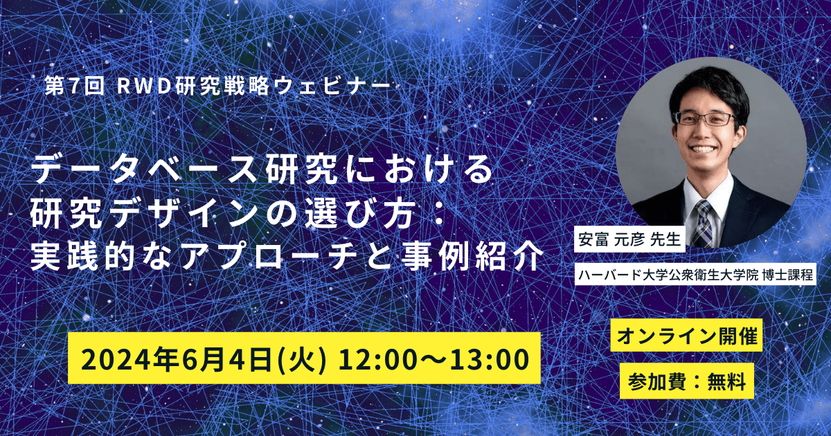 【2024/6/4(火)】第7回RWD研究戦略ウェビナー「データベース研究における研究デザインの選び方:実践的なアプローチと事例紹介」開催決定