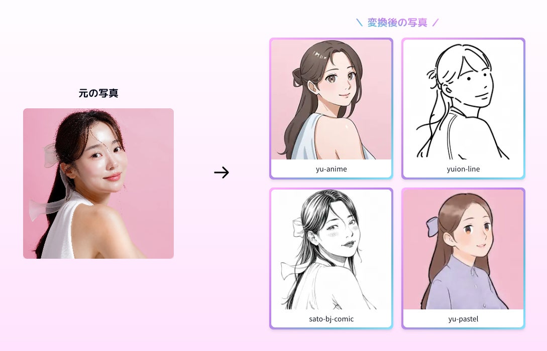 インストール不要!ブラウザだけで、あなたの写真が Loose Drawing、yu など人気イラストレーター公認スタイルで驚きのAI似顔絵に大変身!今すぐ無料で体験。