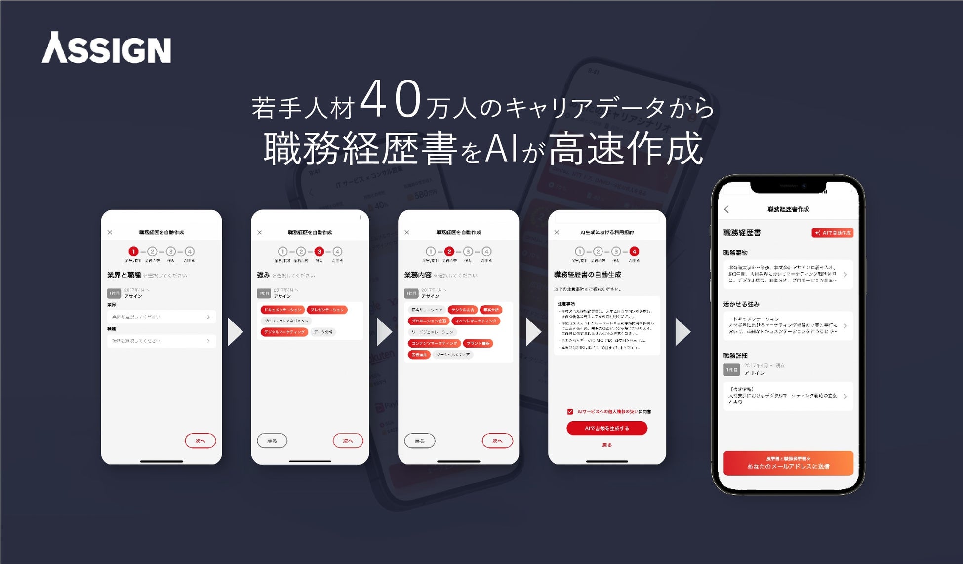 株式会社アサイン(本社:東京都千代田区、代表取締役:小瀬村 卓実、以下当社)が運営する若手ハイエンド特化の転職サイト『ASSIGN』は、生成AIによる職務経歴書の自動作成機能をリリースしたことをお知らせいたします。