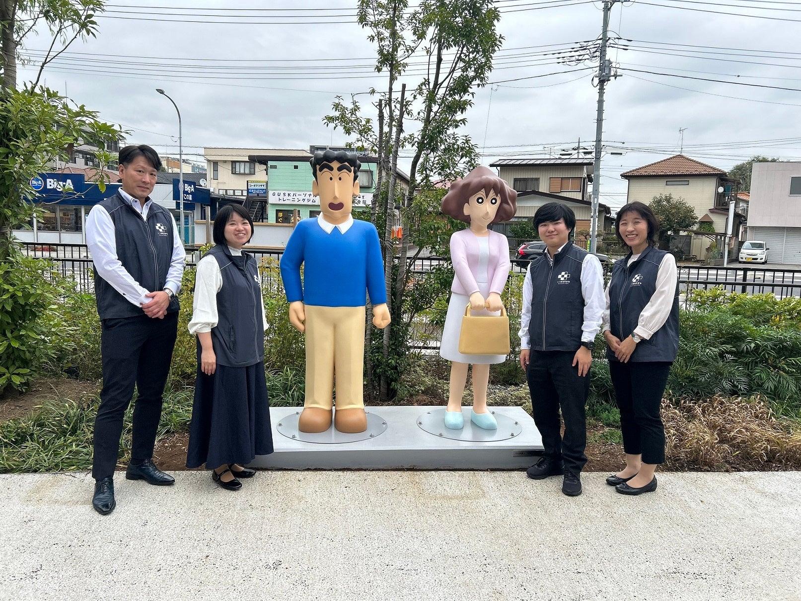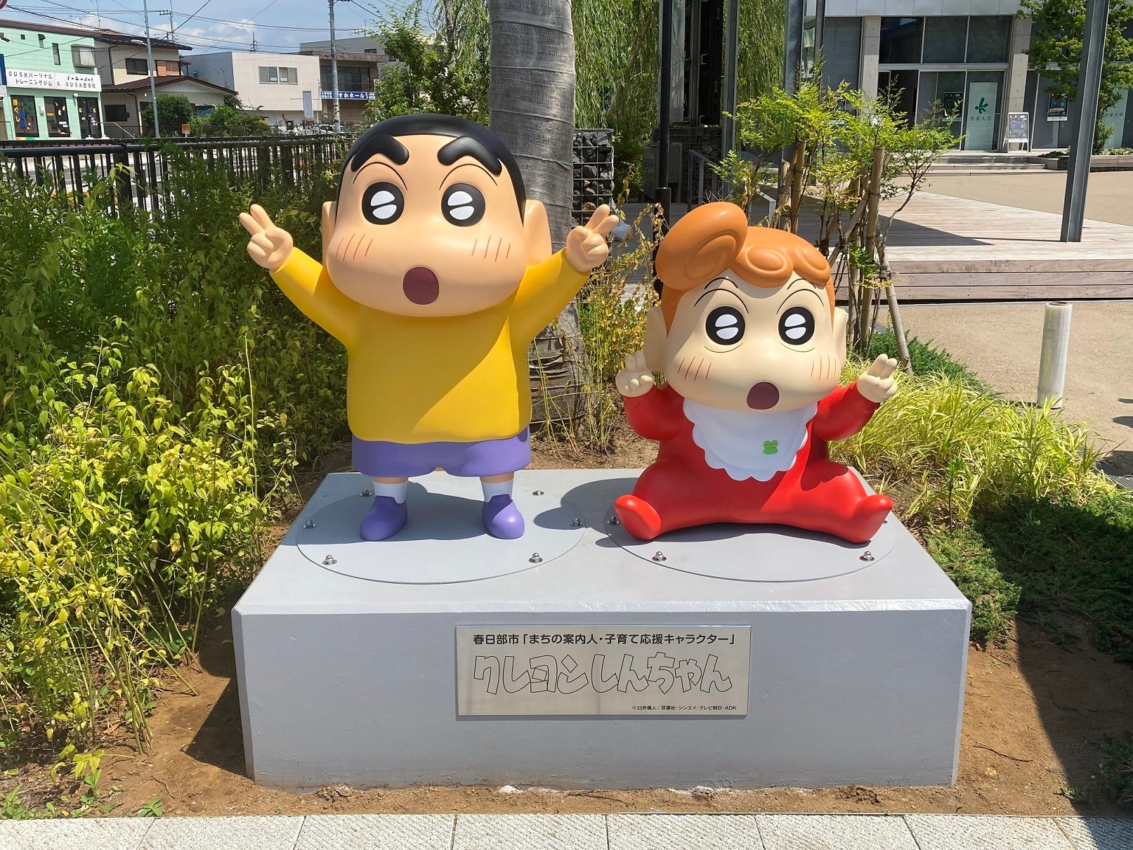 今回、新たに設置した『クレヨンしんちゃん』キャラクターのモニュメントは、服装や表情などを検討し、その場所らしさ、春日部ならでは、を追求したものです。