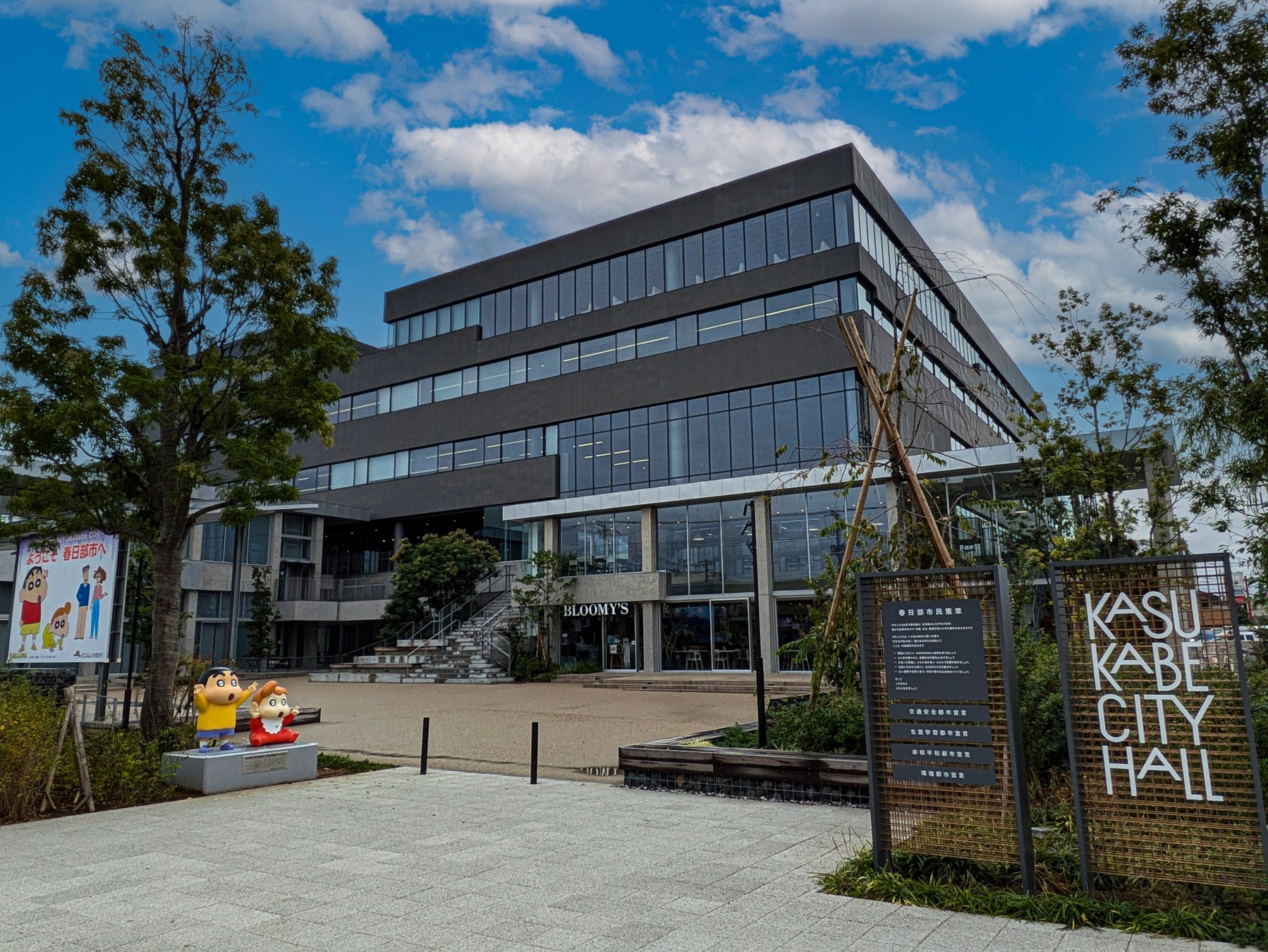 市の「まちの案内人」である『クレヨンしんちゃん』キャラクターのモニュメントと看板が新設され、来庁された皆様をお出迎えします。