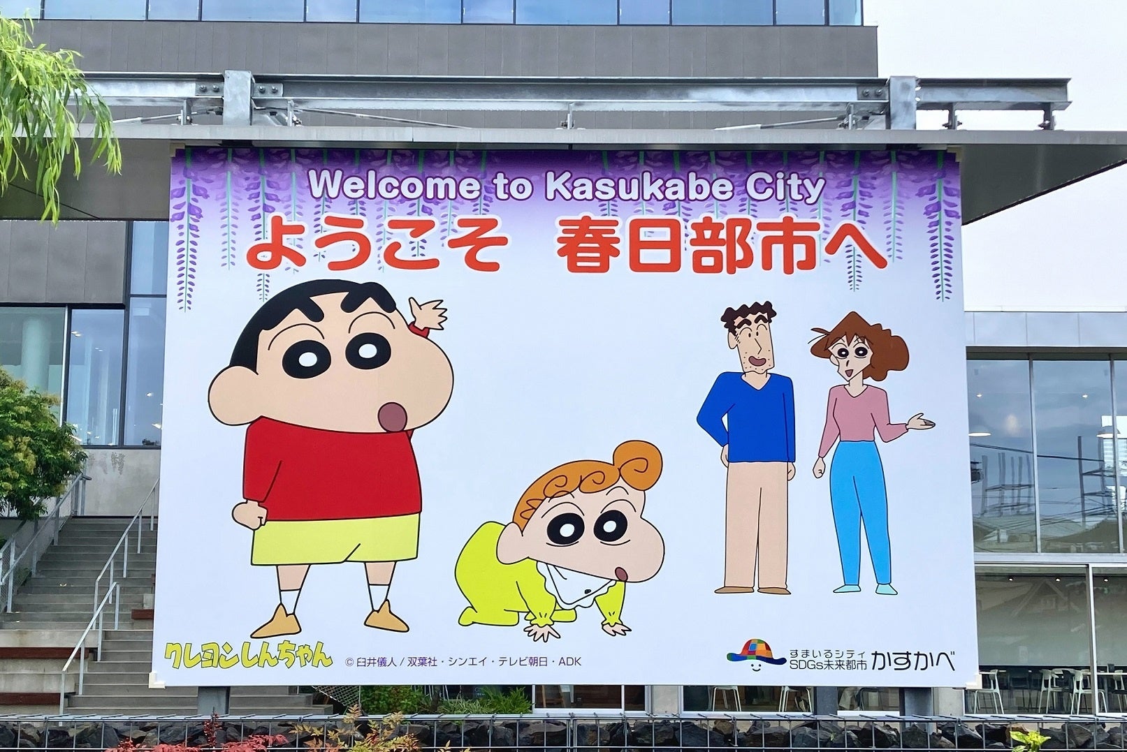 「まちのコモンスペース」の一部である「まちなかステージ」の市役所通り側に設置されたのは、しんちゃんたち野原一家が描かれた屋外看板です。