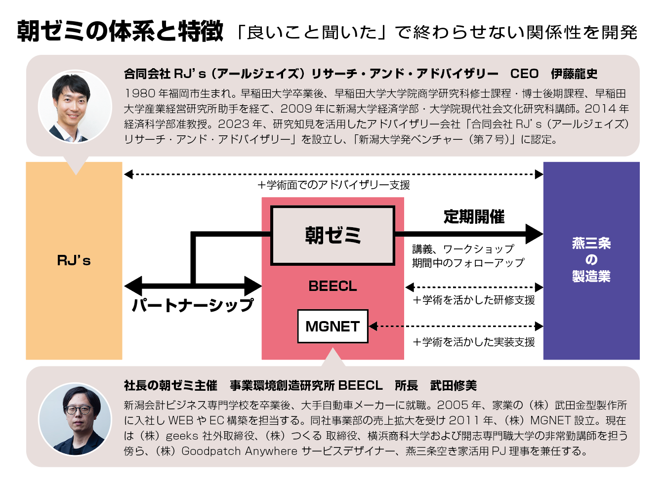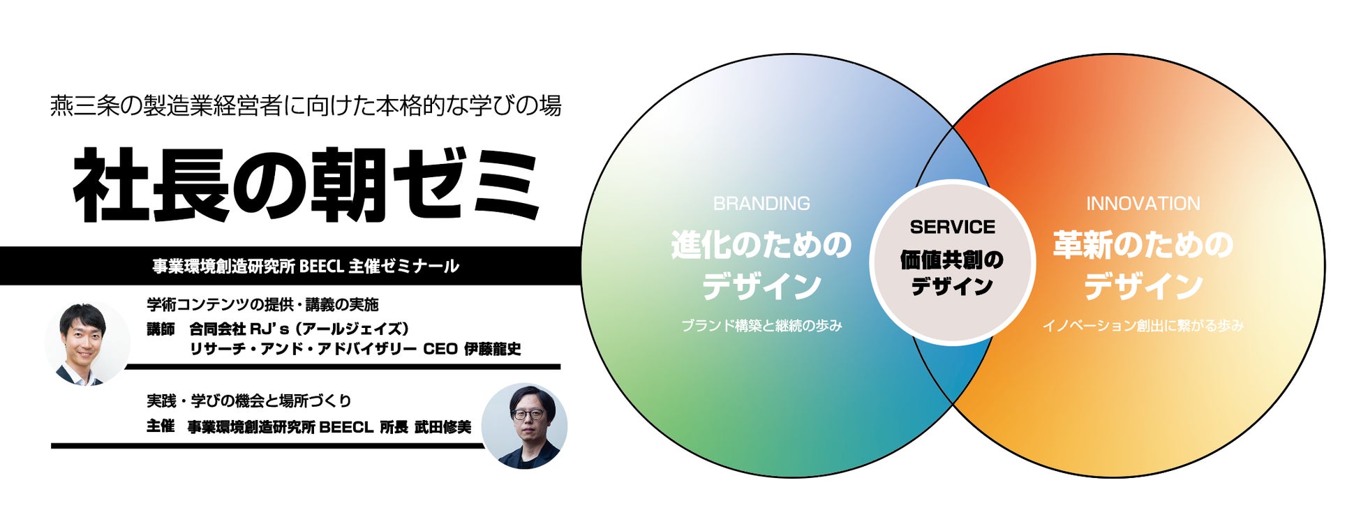 BEECLは、今回の機会を確かなものとするために経営の実践に対して学術的な側面からサポートするアドバイザリー会社であるRJ’sとパートナーシップを結び質の高い学びの場を実現します。経営にまつわる学問と実践は、互いに切り離せない関係にあります。社長の朝ゼミでは、「学問的知識をうまく活用しながら、個社に特有の文脈に合った理論(セオリー)を構築すること」を目指します。特に近年、世界の製造業で注目されている「サービタイゼーション(製造業のサービス化)戦略」という考え方の柱となっている「サービスドミナントロジック」に焦点を当てて学んでいきます。そこ知れぬ知的探究心と生涯現役精神をもつ燕三条地域の製造業経営者の皆様に向けて製造の高付加価値化や社内の高度人材強化などを通して既存事業の発展、革新的な事業承継、そして鋭い角度からの新規事業の開発のヒントとなる知識獲得と思考の機会と場を提供します。「1週間のスタートダッシュを決める!」週初め(月曜7時)の「朝ゼミ」を開講します。