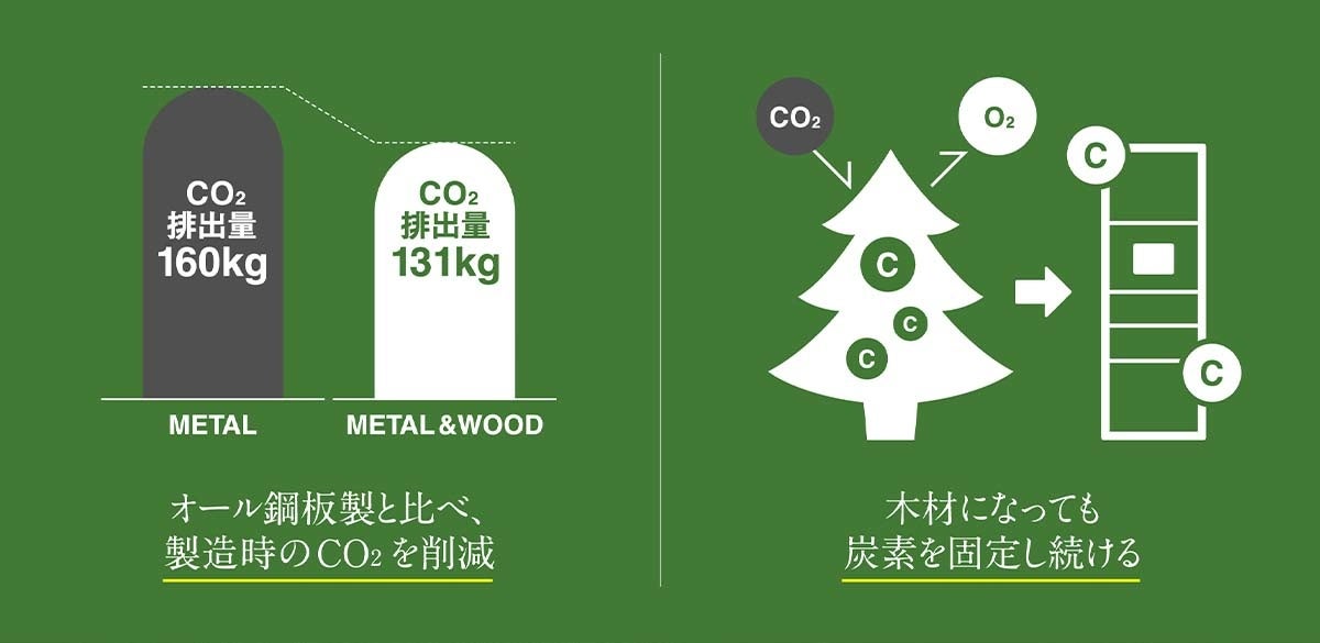 木の電気式宅配ボックス「グリーンハイブリッドボックス」を販売開始。オール鋼板製の宅配ボックスと比べ製造時のCO2排出量を約18%削減(※)。