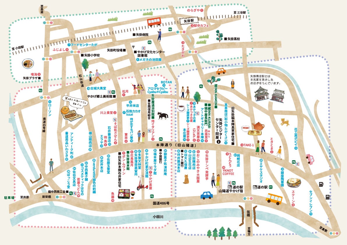 矢掛町のメインストリートである本陣通りを中心に、様々な店舗や施設、歴史的建築物を掲載しています。