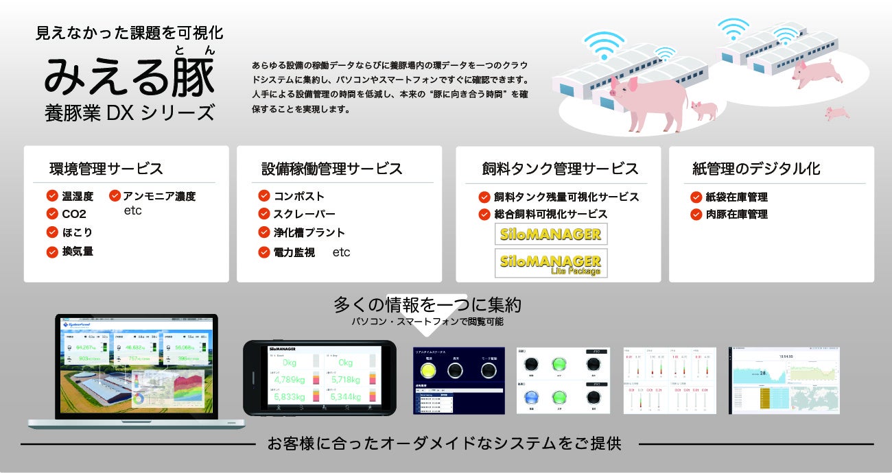 養豚DXシリーズ「みえる豚」は、環境管理・設備稼働管理・飼料タンク管理・紙管理のデジタル化などを含めた総合管理サービスです。お客様の設備・規模・ご要望に合わせて適切な製品・サービスを組み合わせ、当社ならではの“オーダメイドのIoTシステム” をご提供します。