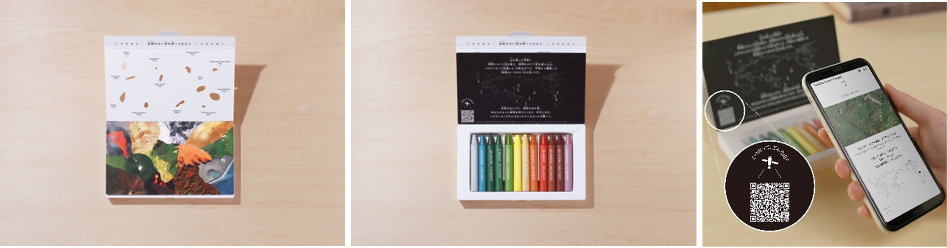 本商品パッケージは、「海のクレヨン」でも好評だった体験型の仕様となっており、衛星写真の色が見え隠れしている蓋を開けると、それぞれのクレヨンの色がどの場所から抽出されているのかわかるようになっています。また、中蓋には、公式ホームページへとつながる二次元コードがあり、「海のクレヨン」を含む、クレヨンシリーズで扱っている様々な衛星写真や場所の解説などを確認することができます。