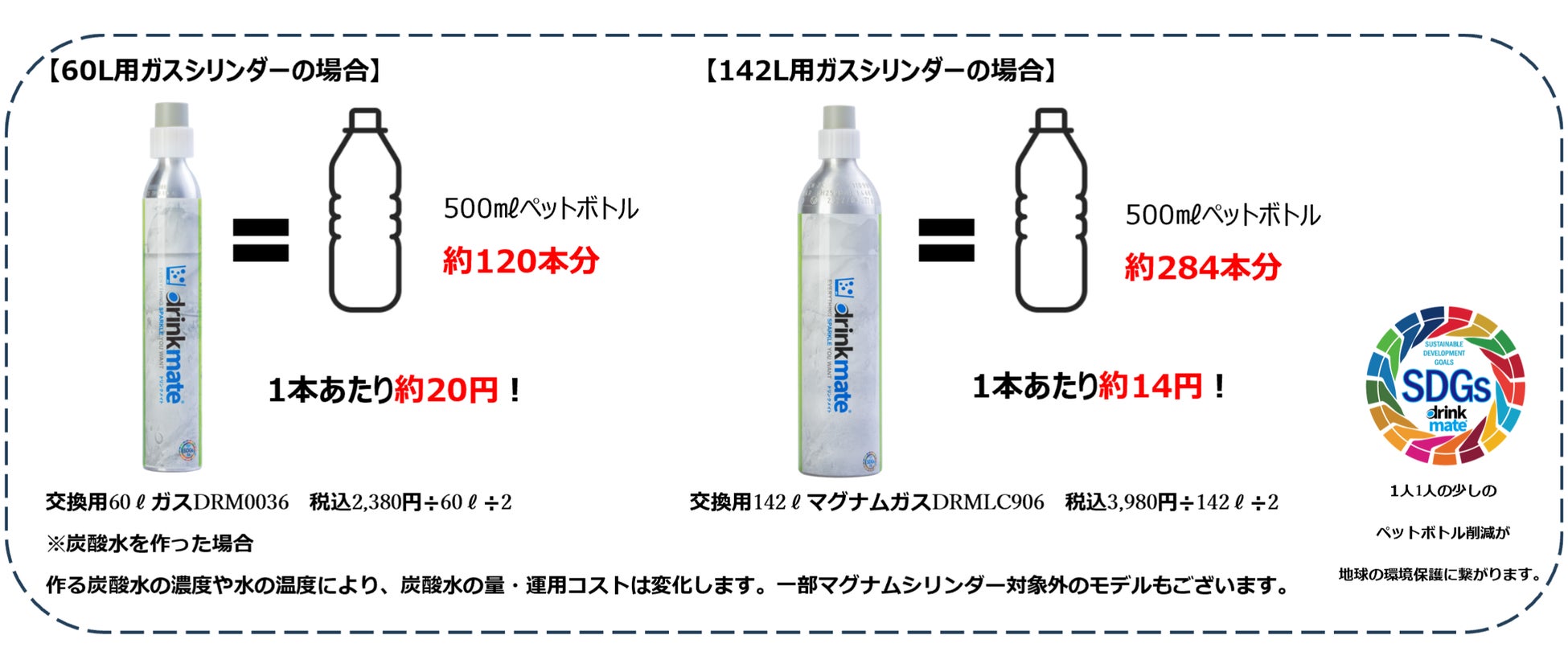 交換用142Lマグナムガスシリンダーを使用した場合、500mlあたり約14円で炭酸水が作れます。