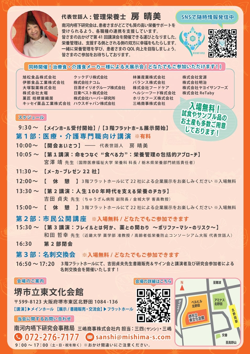 第1 部では、栃木県から宮澤靖先生(国際医療福祉大学)をお招きし、栄養管理の包括的アプローチについてご講演いただきます。また、沖縄で活躍される吉田貞夫先生(ちゅうざん病院/金城大学)には、人生100 年時代を支える栄養の力についてお話しいただきます。全国レベルの知見を南河内で学べる貴重な機会です。
