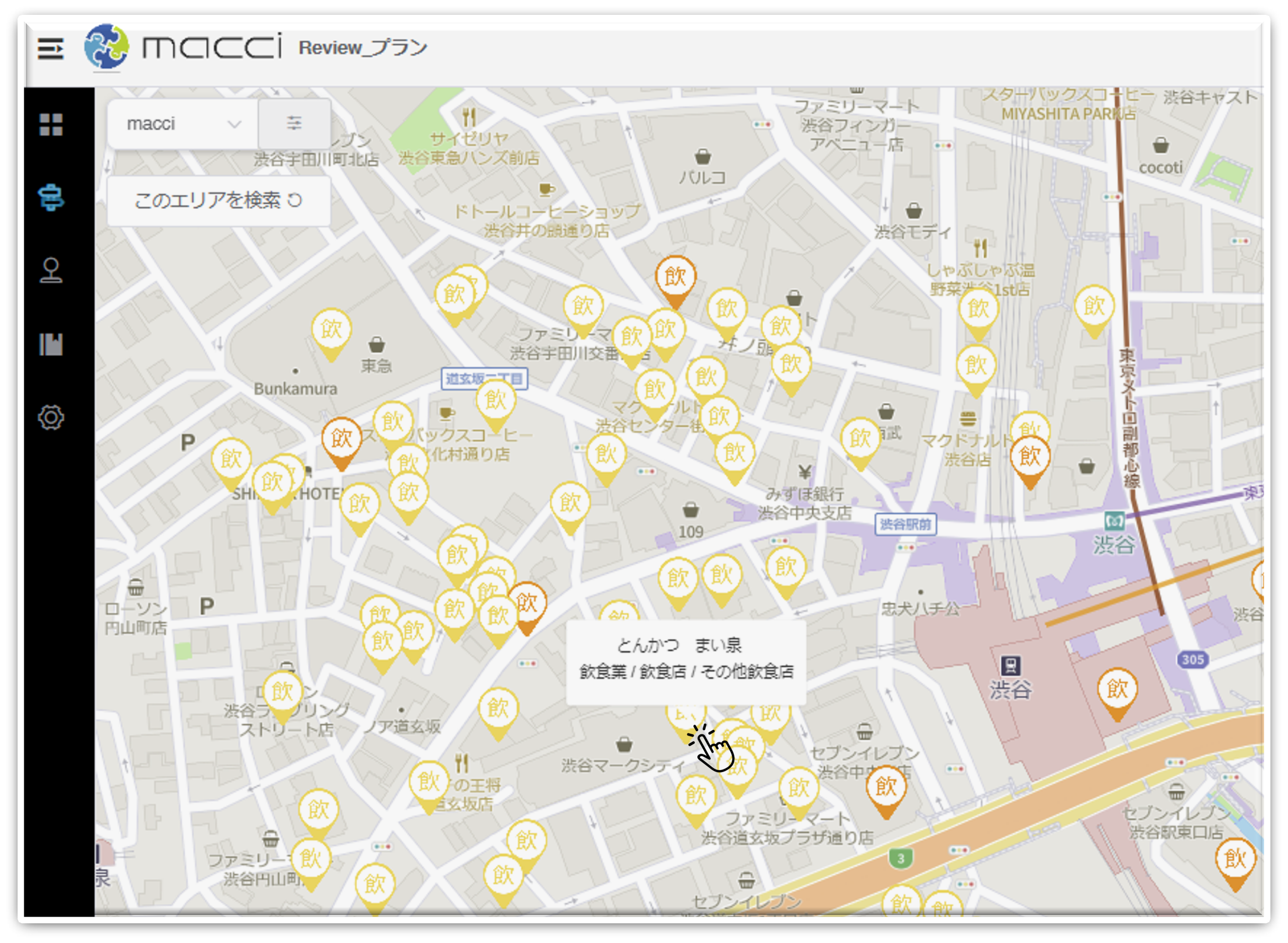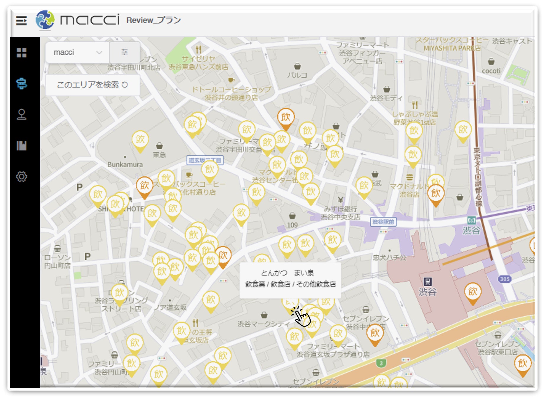 株式会社Review(リビュー)の「macci」は、300万件の街中の店舗・施設データを搭載したビジネスマップです。飲食店をはじめ、 物販・小売、サービス業、教育関連、生活インフラ、冠婚葬祭、趣味・娯楽など、157ジャンル538種の店舗・施設情報を保持。新規オープンした店舗情報もリアルタイムで把握できます。