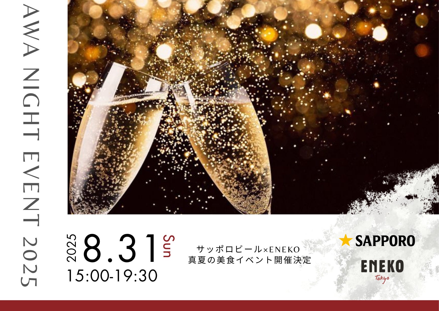 【 2025年8月31日 】株式会社プリオレストラン&ウエディングスが運営する、「ENEKO Tokyo( エネコ東京)」はサッポロビール様とのコラボレーションイベント「AWA Night 2025」を開催することとなりました。