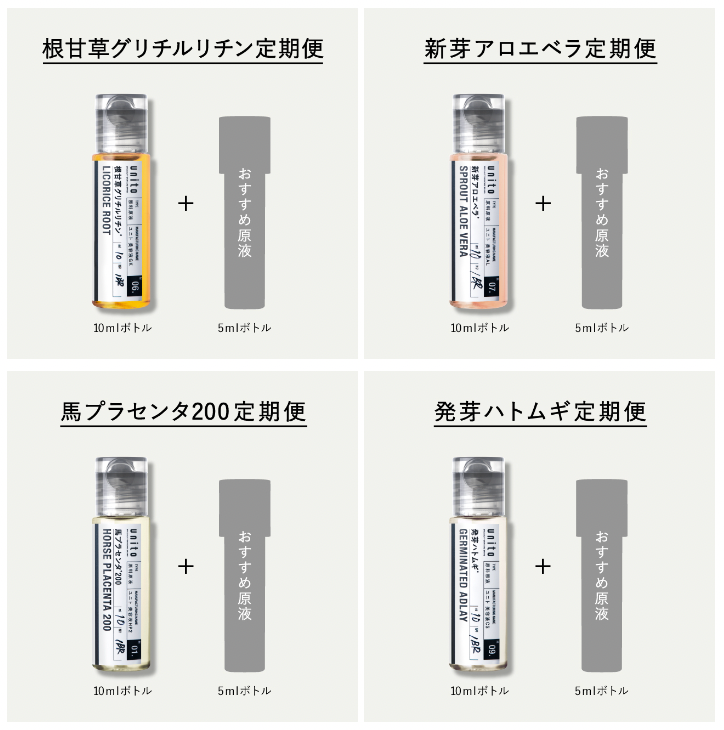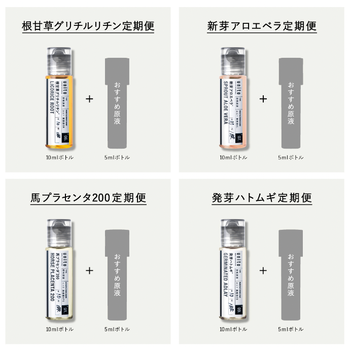 特にリピーターの多い4種類の原料美容液の定期便です。お客様にお選びいただいた10mlサイズの原料美容液と、相性の良い原料美容液5mlサイズを2ヶ月ごとに1回の全3回、通常価格よりもお得なセットでお届けします。