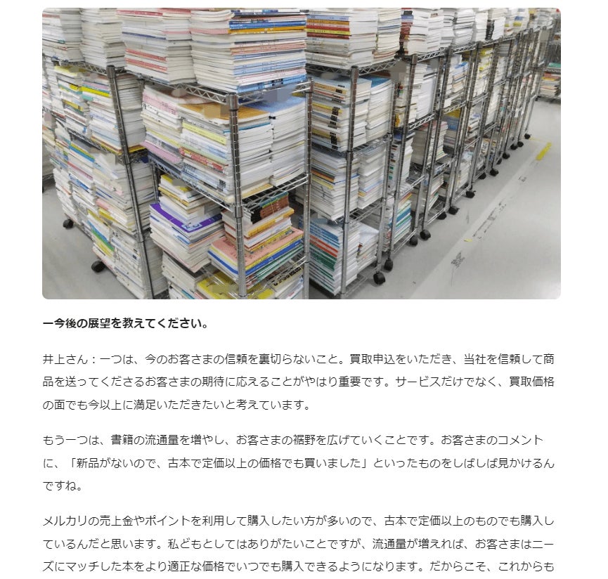 株式会社ブックスドリーム(本社:大阪府大阪市、代表取締役:井上聖也)は、参考書・専門書・医学書・大学の教科書・赤本・予備校テキスト・教材を専門に買取・販売しており、販売についてはこれまでは主に「Amazonマーケットプレイス」や「ヤフーオークション」「ヤフーショッピング」で行ってきましたが、2023年に「メルカリ」でも販売を開始。大変ご好評をいただき、2024年6月で出店一周年を迎え、6万評価と8000フォロワーを獲得、出品数も25万点以上になりました。