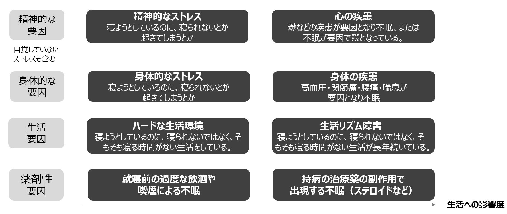 今回の定性調査から確認できた「精神的な要因」や「身体的な要因」、「生活上の要因」以外にも、「薬剤性要因」も加え大きく4つの要因と、生活への影響度の強弱で不眠状況は8つに分類ができる。