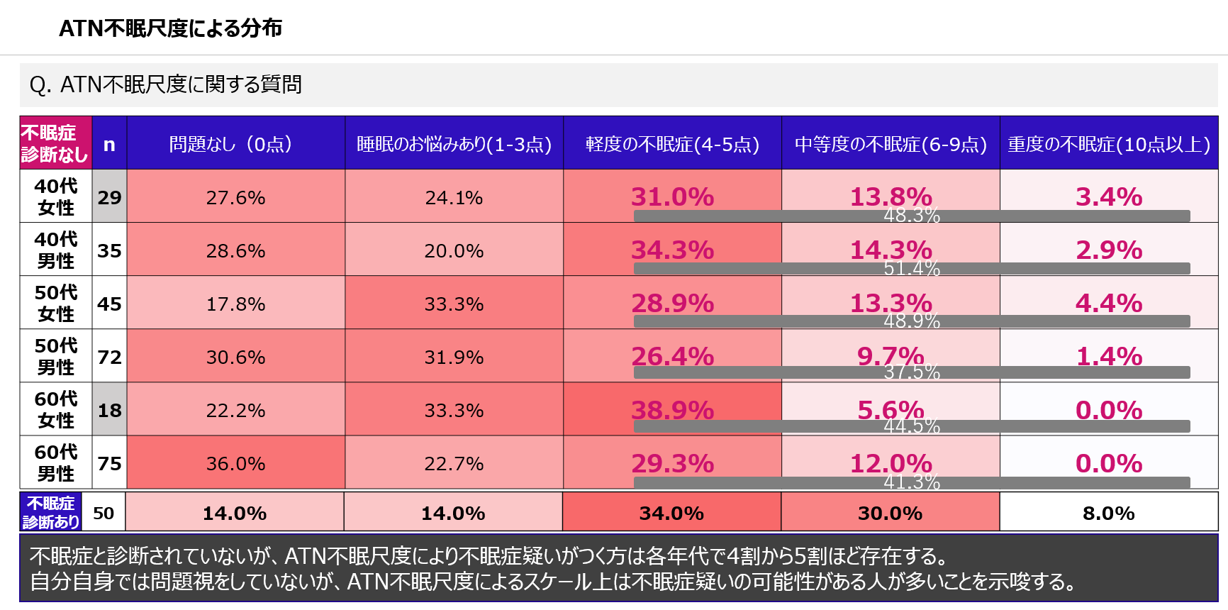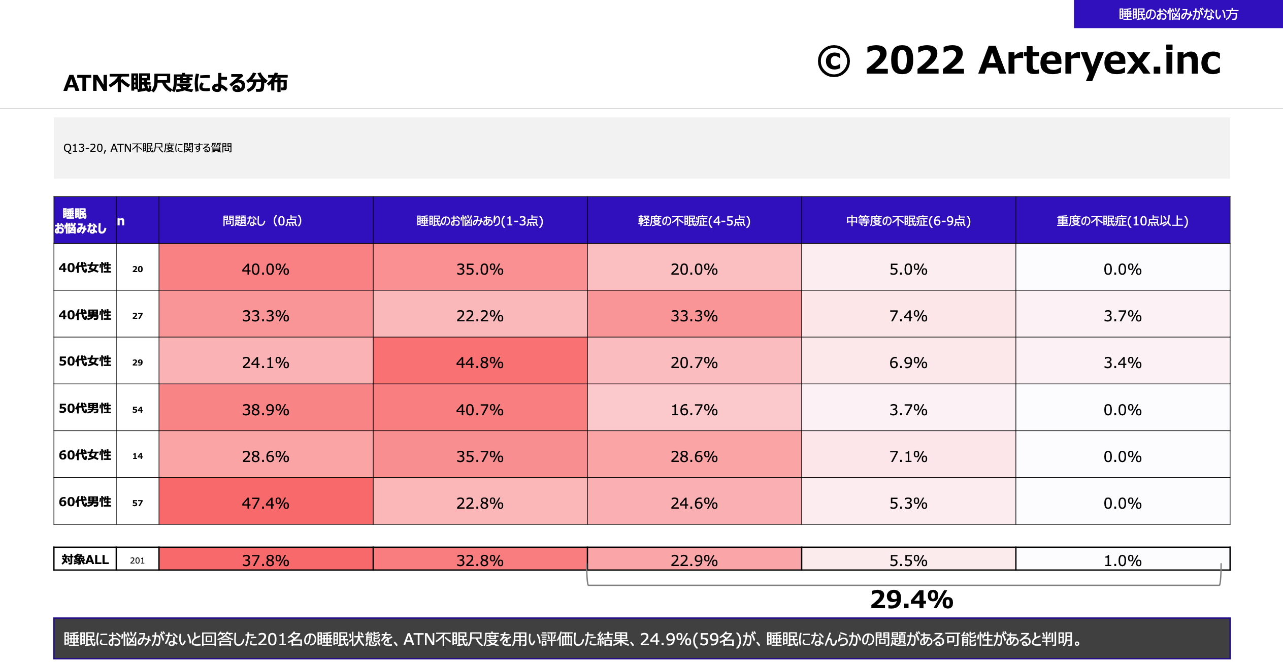 睡眠に悩みがないと回答した201名の睡眠状態を、アテネ不眠尺度をもちい評価した結果、29.4%(59名)が、睡眠に何らかの問題がある可能性があると判明