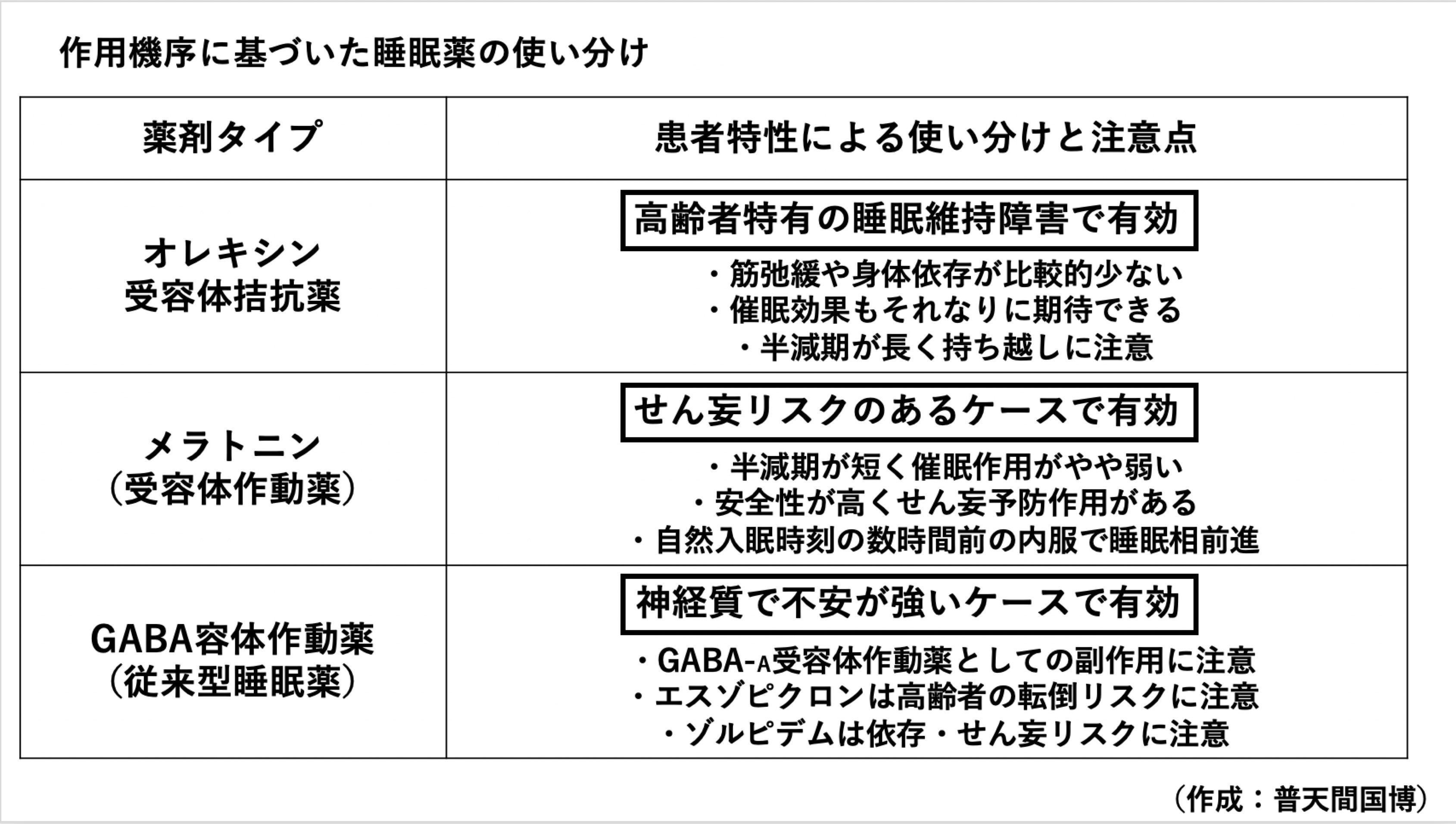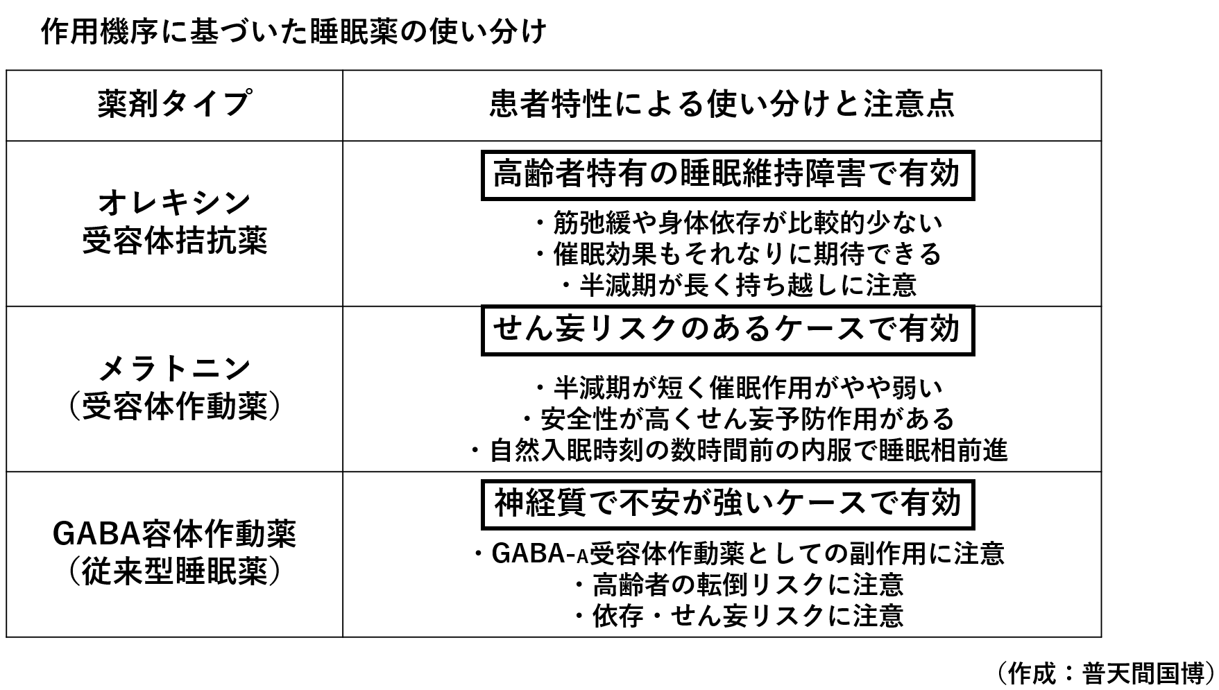 従来型の睡眠薬は、調査回答者が心配するように依存性が強いものが多く、長期に治療が続くことで経済的な負担も懸念されていた。しかし近年は依存性の軽減に成功した睡眠薬が複数登場している。特にオレキシン受容体拮抗薬はリスク・ベネフィットバランスが優れており、睡眠薬選択の主流となりつつある。睡眠薬に対する不安から不眠症を放置することは好ましくないためまずは医師に相談をして欲しい。