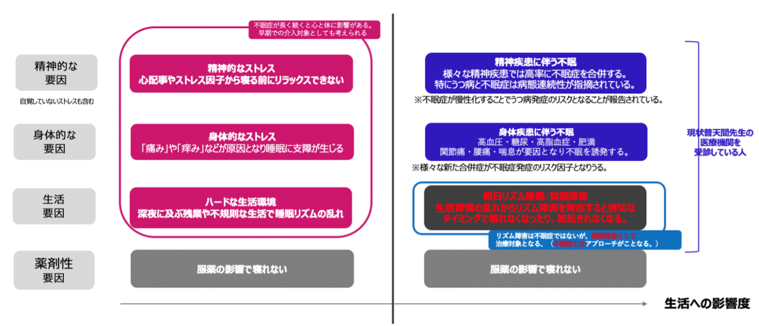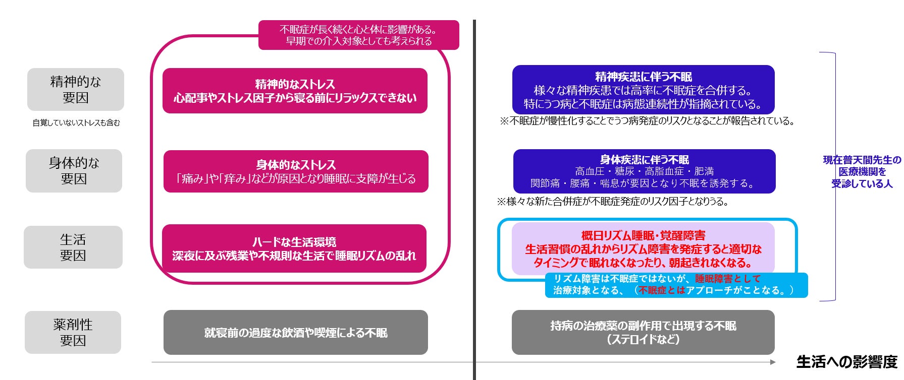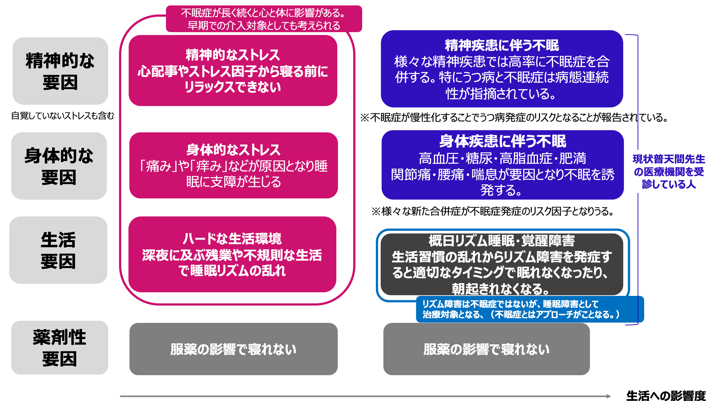 不眠症で医療機関を受診するのはうつ病などの精神疾患を合併したケースや身体疾患に伴う二次的な不眠症(身体的苦痛に伴う不眠)など不眠症状が重篤化しやすい背景を抱えていることが多い。(以下図表の青枠部分を参照)
