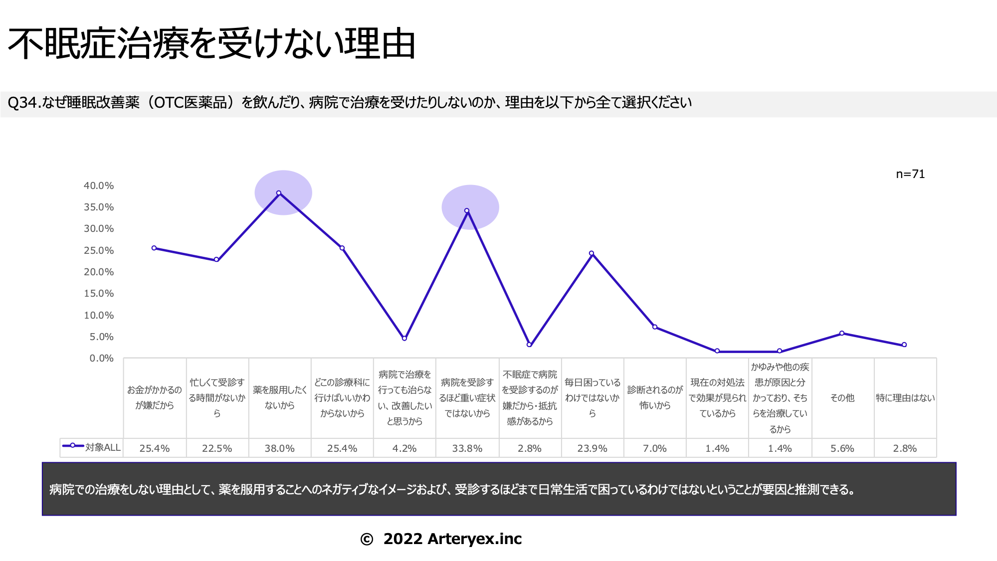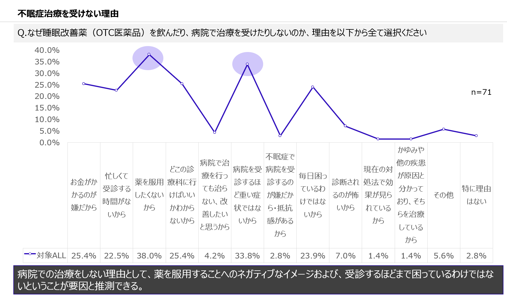 睡眠に悩みがあるが、現在医療機関の受診あるいはOTC医薬品を服用していない71名のうち、38.0%(27名)が「薬を服用したくない」と回答し、33.8%が(24名が)「病院を受診するほど重い症状ではない」と回答。