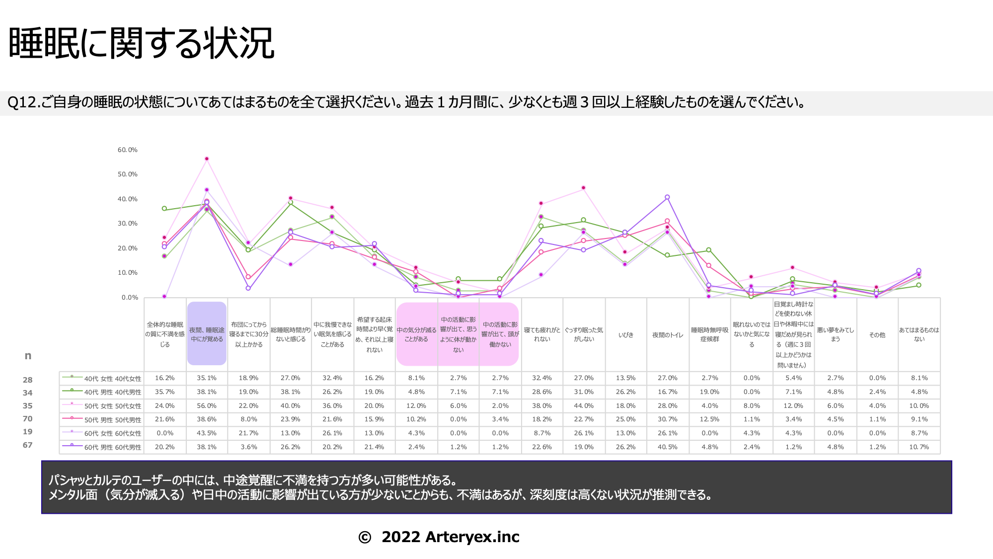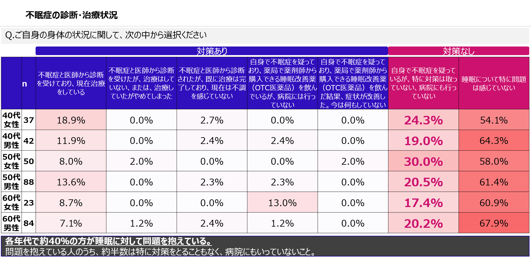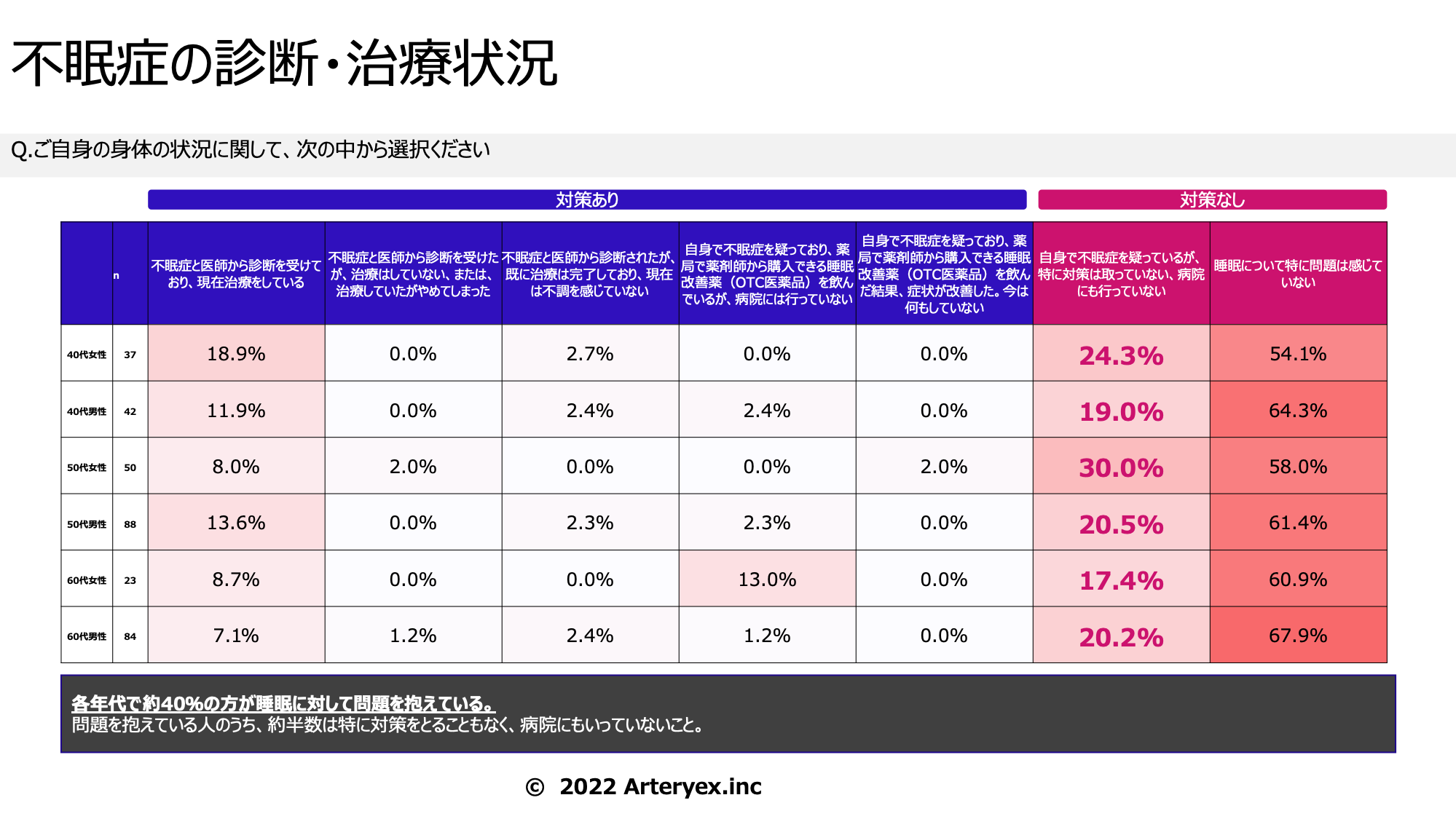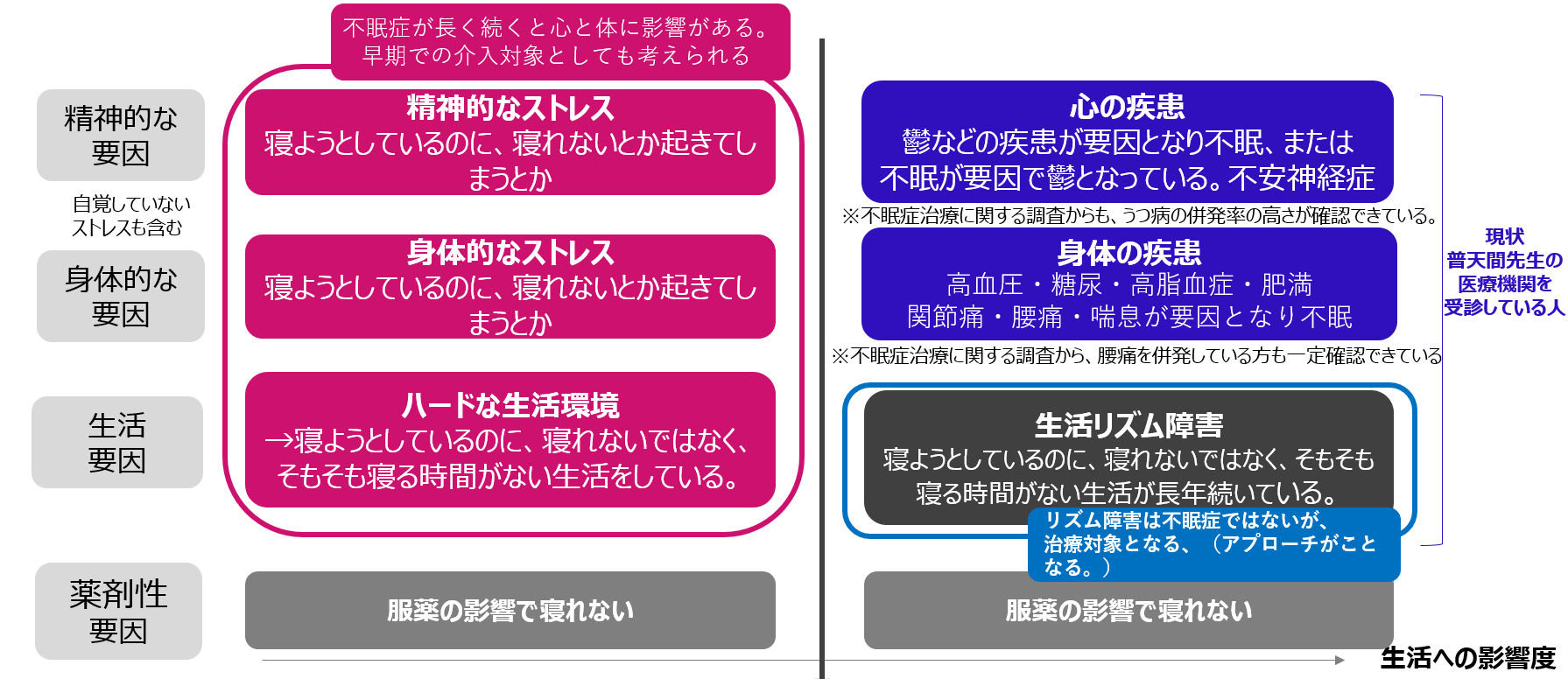 その結果、「精神的な要因」や「身体的な要因」、「生活上の要因」があることが背景として確認できました。一方で生活上の影響度が無いことから、睡眠状態に対する課題感がうすく、お薬での治療へのネガティブな印象と相まって、医療機関への受診は検討されていない状況が確認できました。