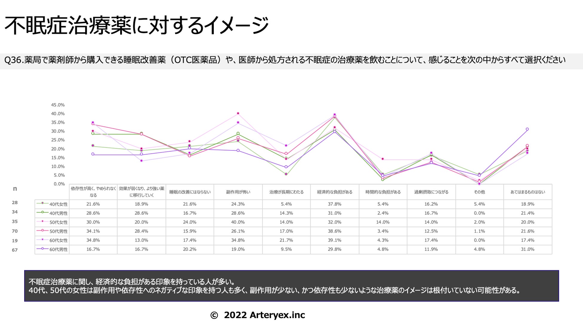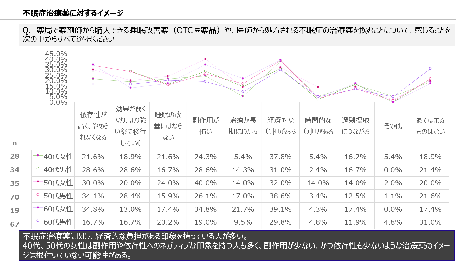 睡眠治療薬に対するイメージとして「経済的な負担がある(34.3%)」、「依存性が高くやめられなくなる(26.9%)」、「副作用が怖い(27.2%)」というネガティブなイメージがある。