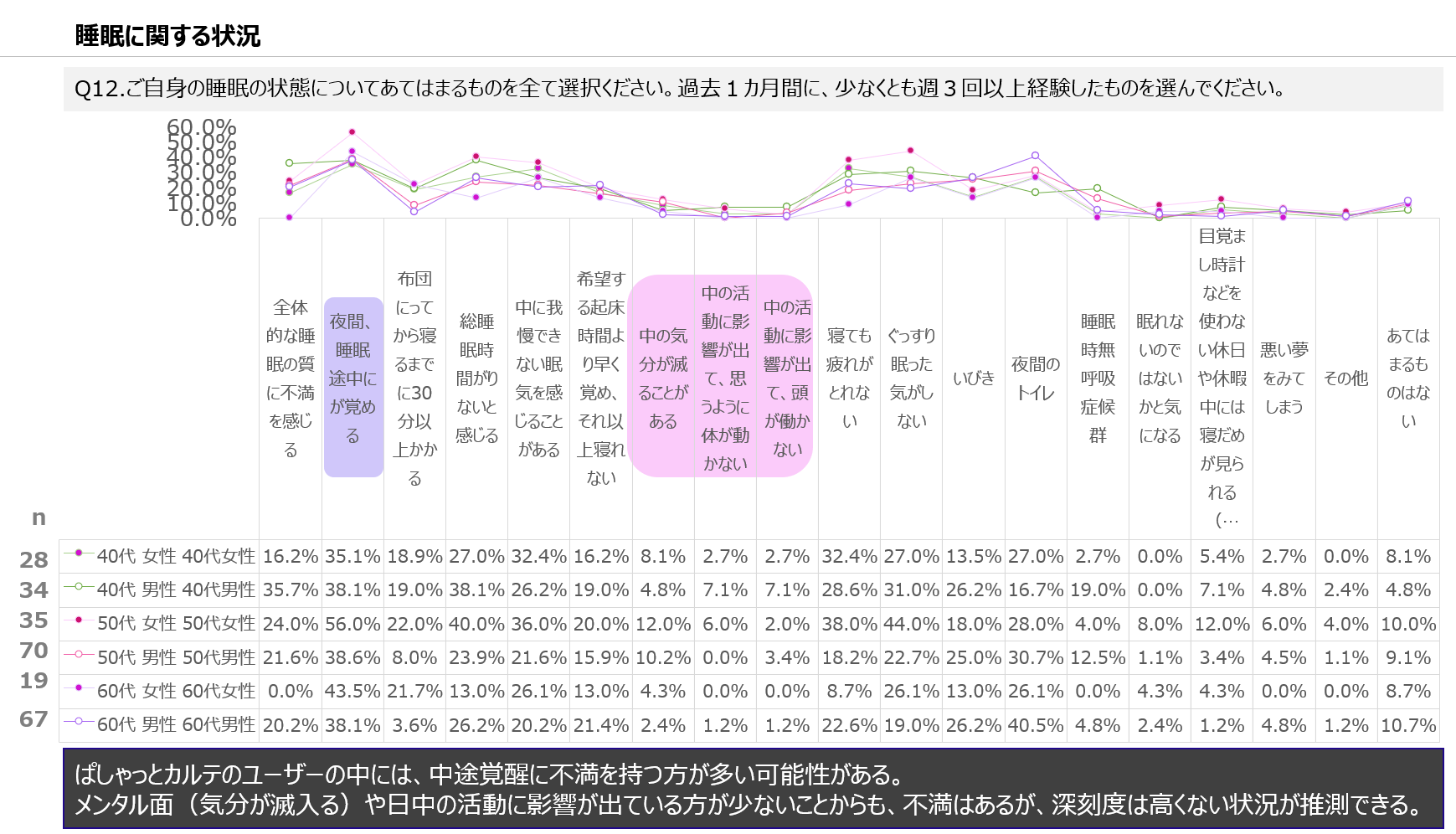 調査回答者のうち、41%が「夜間、途中で目が覚める」と回答し、特に女性50代のうち半数以上の56%(28名)が症状があると回答。