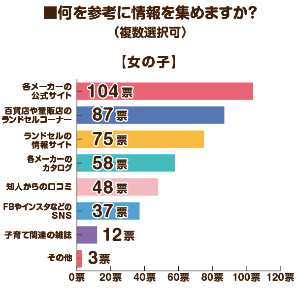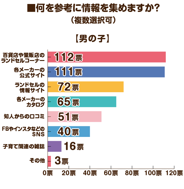 何を参考に情報を集めますかという質問に対しては、「百貨店や量販店のランドセルコーナー」と「各メーカーの公式サイト」が最多得票となっています。