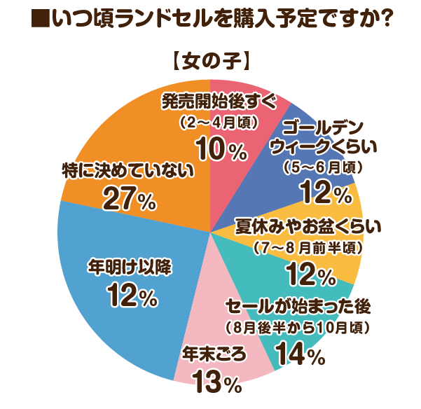 いつ頃ランドセルを購入予定ですかという質問に対しては、男女ともに回答が分散しました。