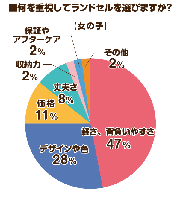 女の子では「デザインや色」が28%とかなり多い得票率になっていて、男女で差が出る結果となりました。