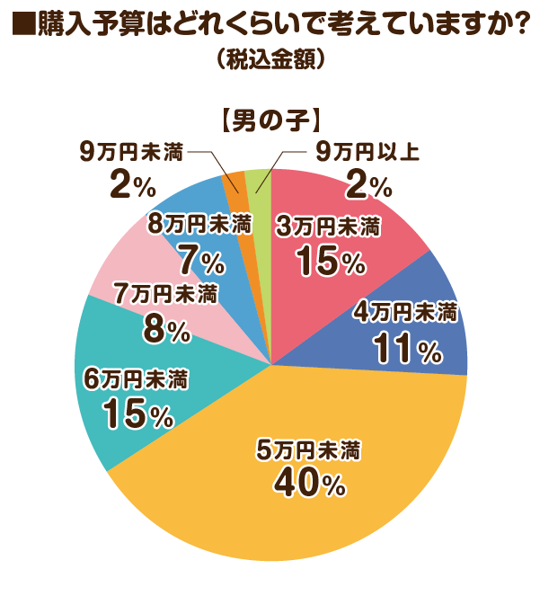 全体の予算で比較した場合、男の子で「3~5万円未満」の合計が66%なのに対して、女の子では56%となっており、やや女の子の方が予算が多めという結果でした。