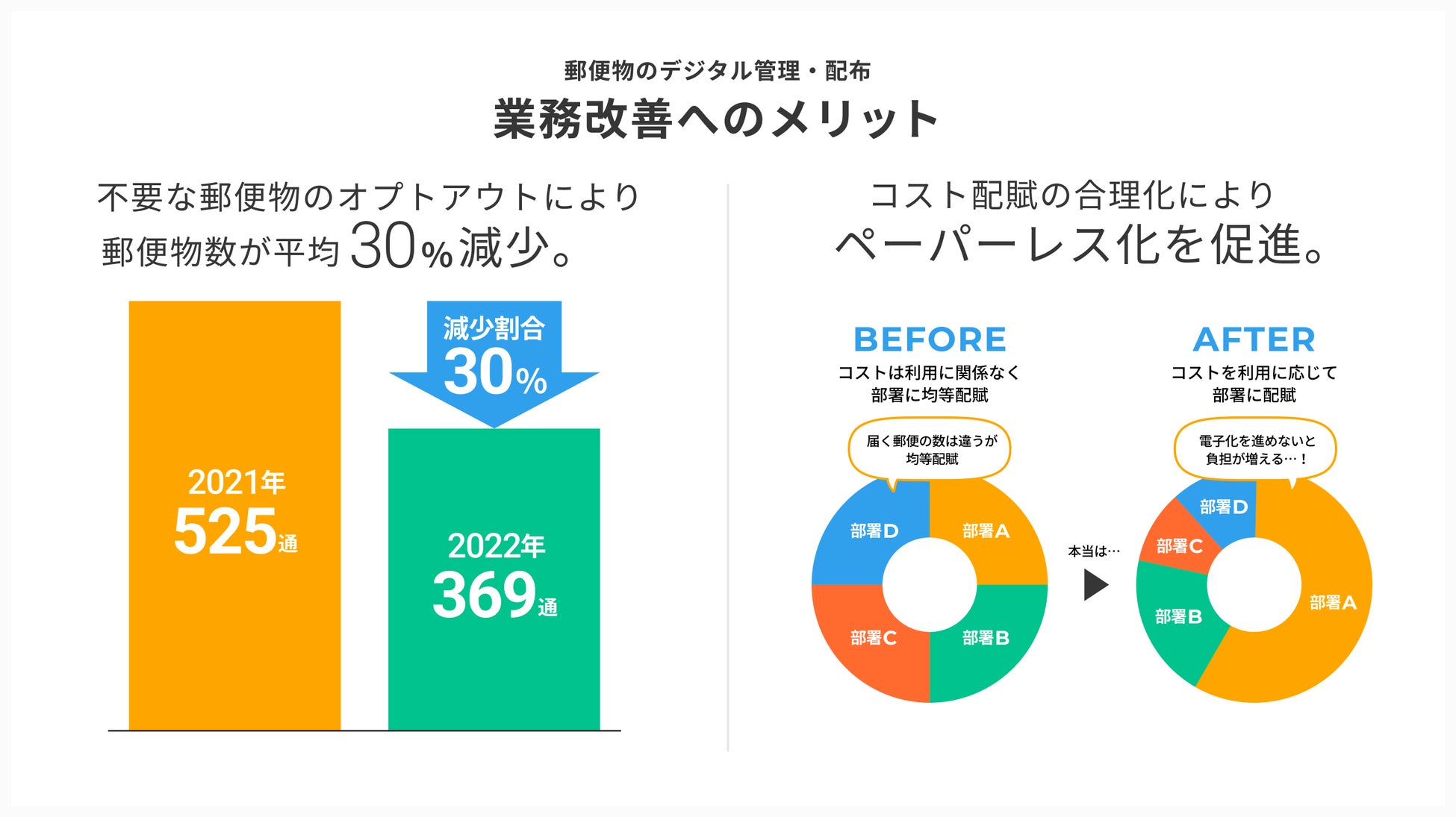 そのほか、オフィスに届く郵便物の数に応じて総務・メール室のコストを配賦することで郵便物の電⼦化が遅れ、いまだに多くの郵便物が届く部署には処理する⼯数に応じたコストを負担してもらうようにした結果、郵便物の電⼦化が加速した事例もあります。