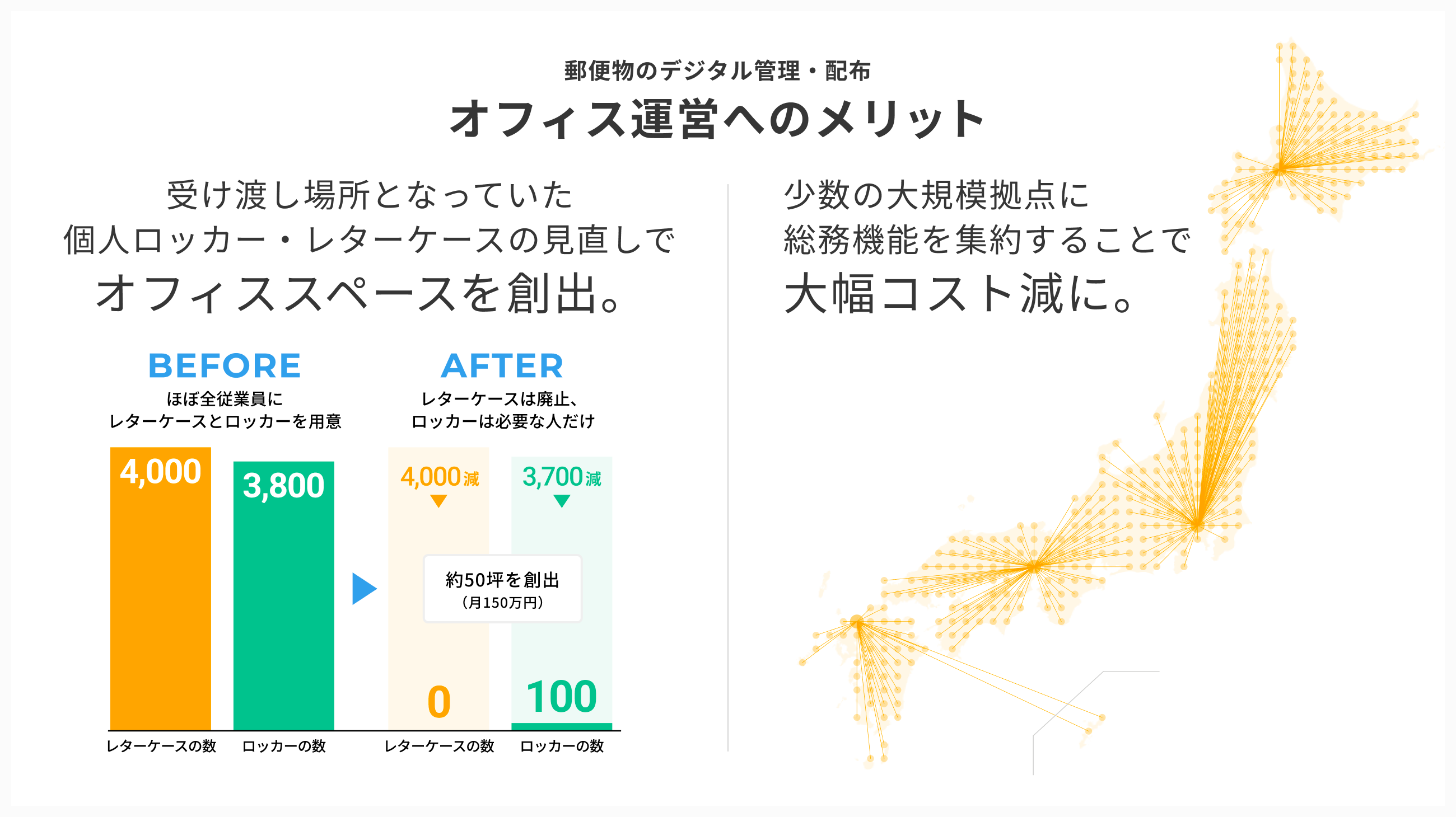 またオフィスに届く郵便物を複数の拠点に集約した上で、原則的に電⼦配布することにより、小規模な各拠点から郵便物管理の業務を失くし、総務機能を規模の大きい少数の拠点に集約させたことで、⼤幅なコスト削減に成功した事例もあります。