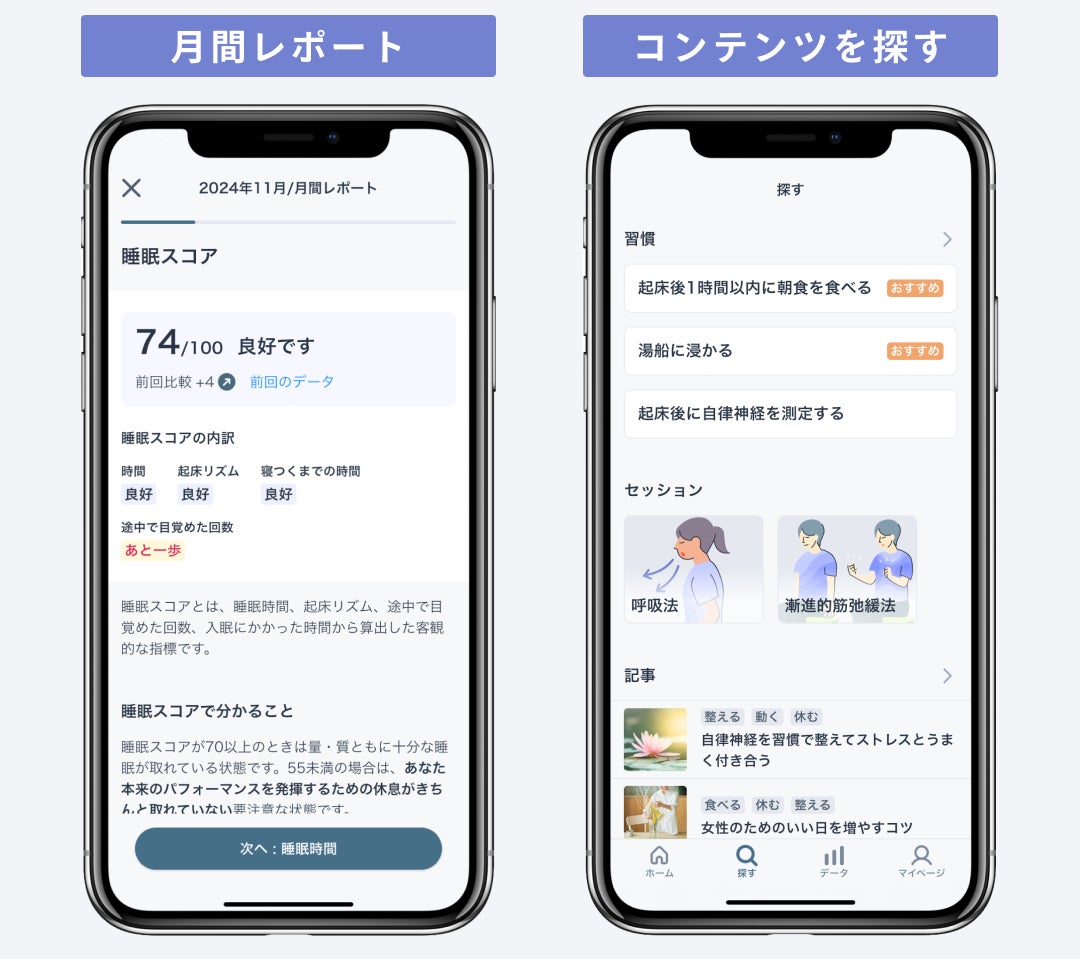 月間レポートでユーザーの心身の状態の傾向を可視化・分析。その結果に基づき、おすすめの習慣を提案します。