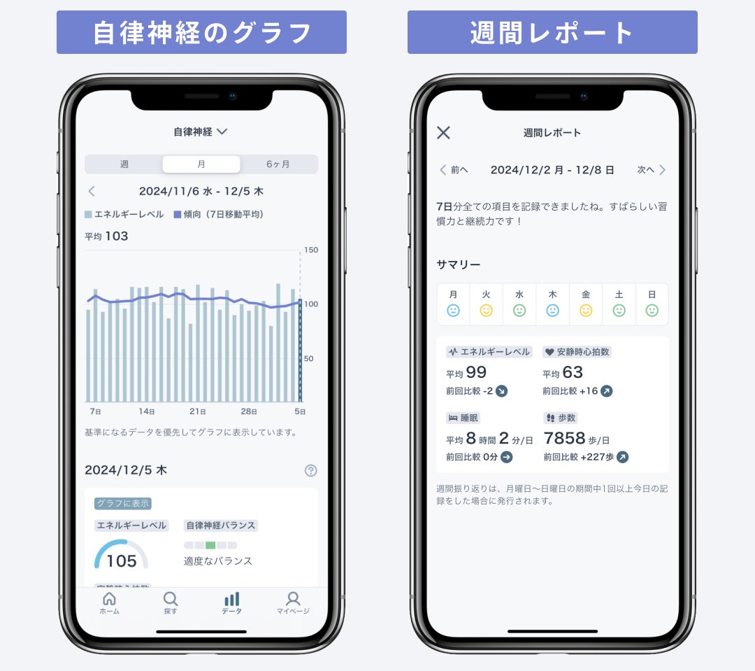 自律神経の状態、安静時心拍数、睡眠、体調など、記録したデータをいつでも確認可能。心身の状態の傾向を把握することで、「なんとなく不調」の原因を見つけ、改善の手助けに。