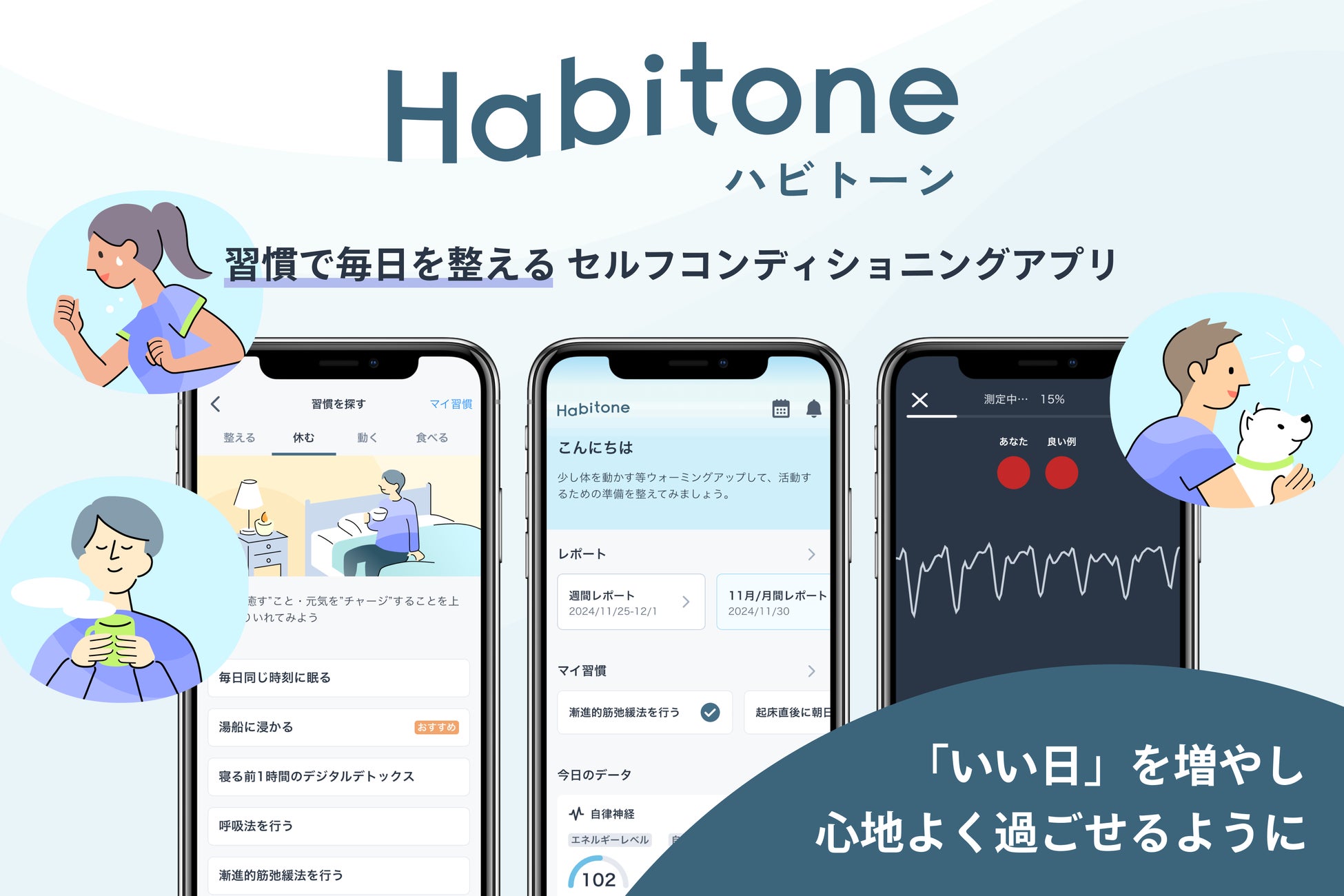 スマートフォンのカメラで自律神経を測定し、自分のストレスを見える化することで多くの方にご使用いただいていたストレススキャン。そこから生まれ変わったHabitoneは、自律神経の状態の測定に加え日々の体調も記録できます。また、把握した心身の状態から不調を解決するための「習慣」を提案するなど、「いい日」を増やすために暮らしを変えるサポートをします。